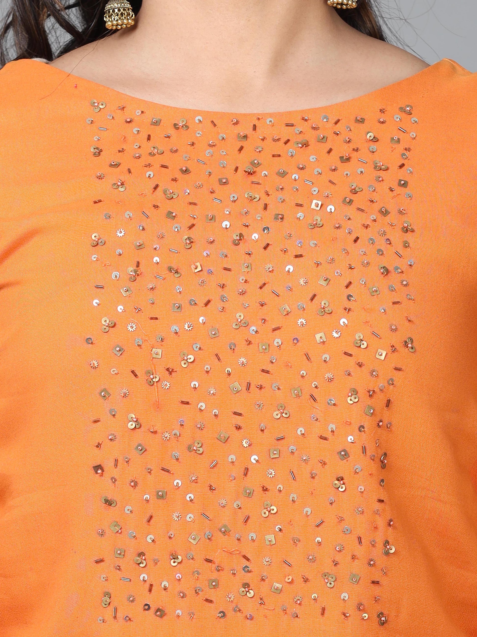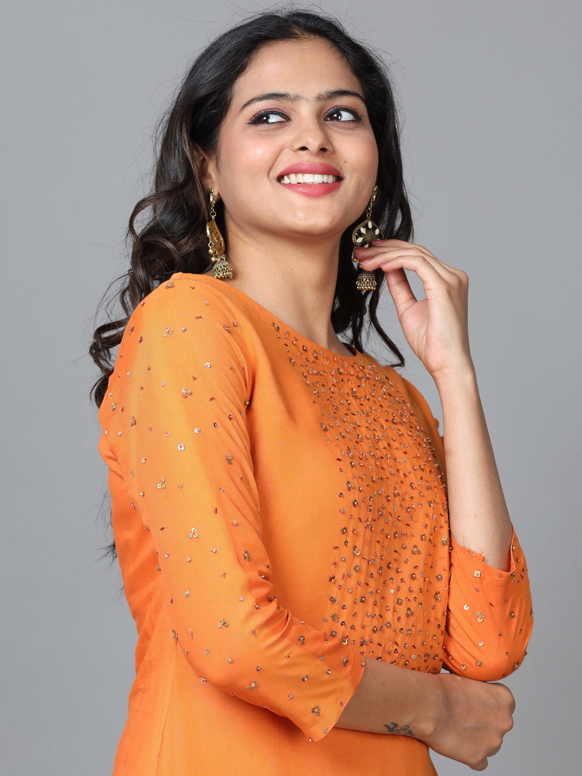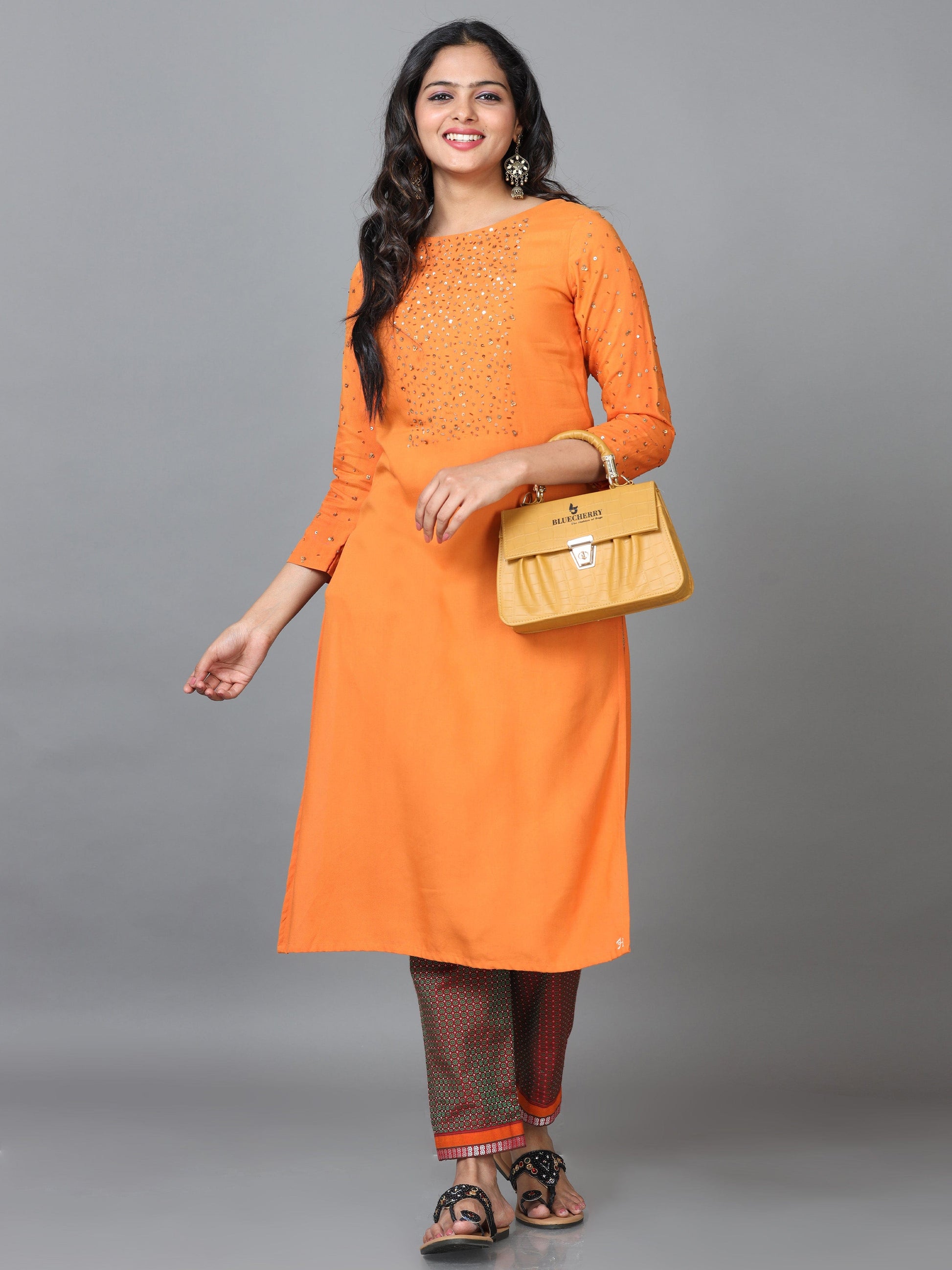 Orange 3/4 Sleeve Rayon Solid Straight calf-long Kurta Set