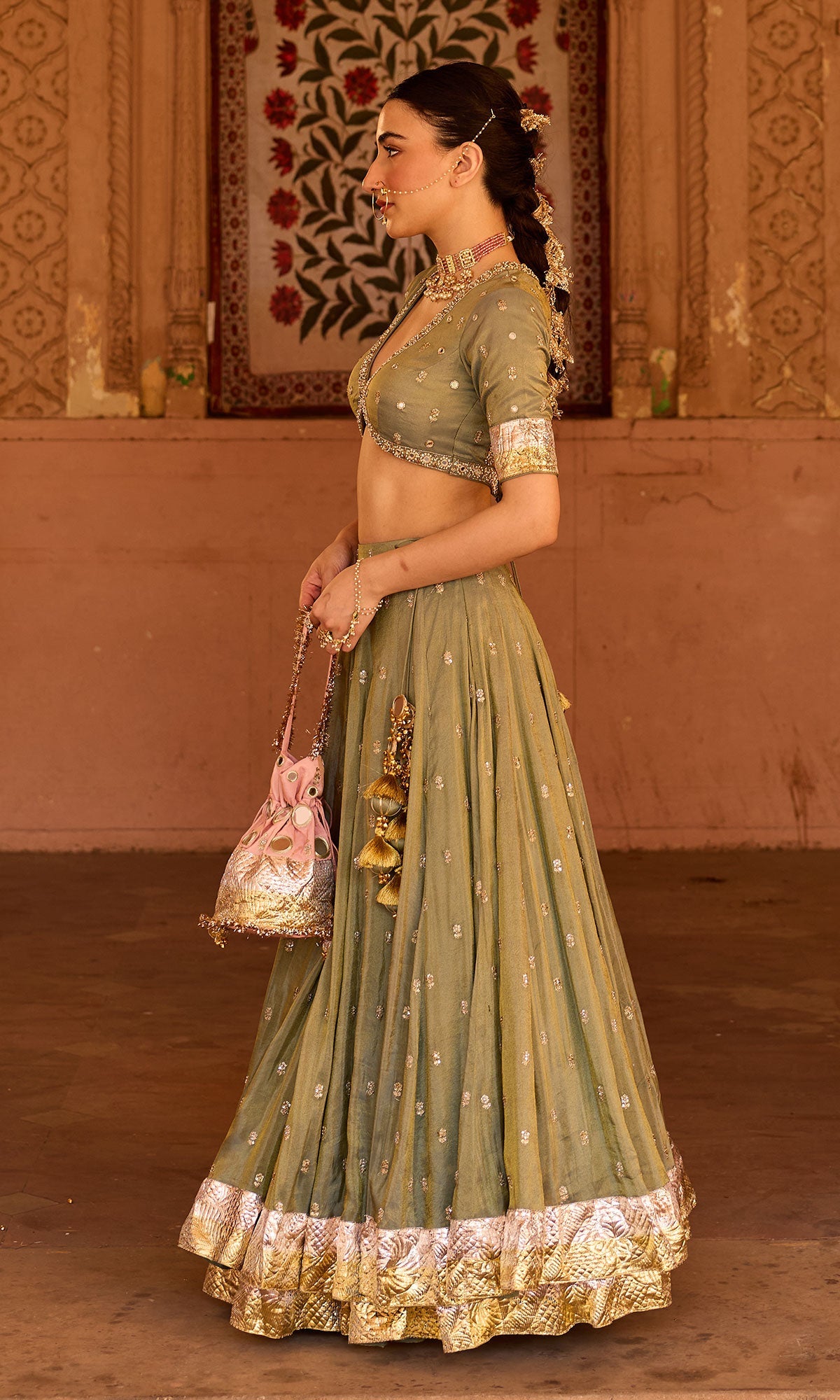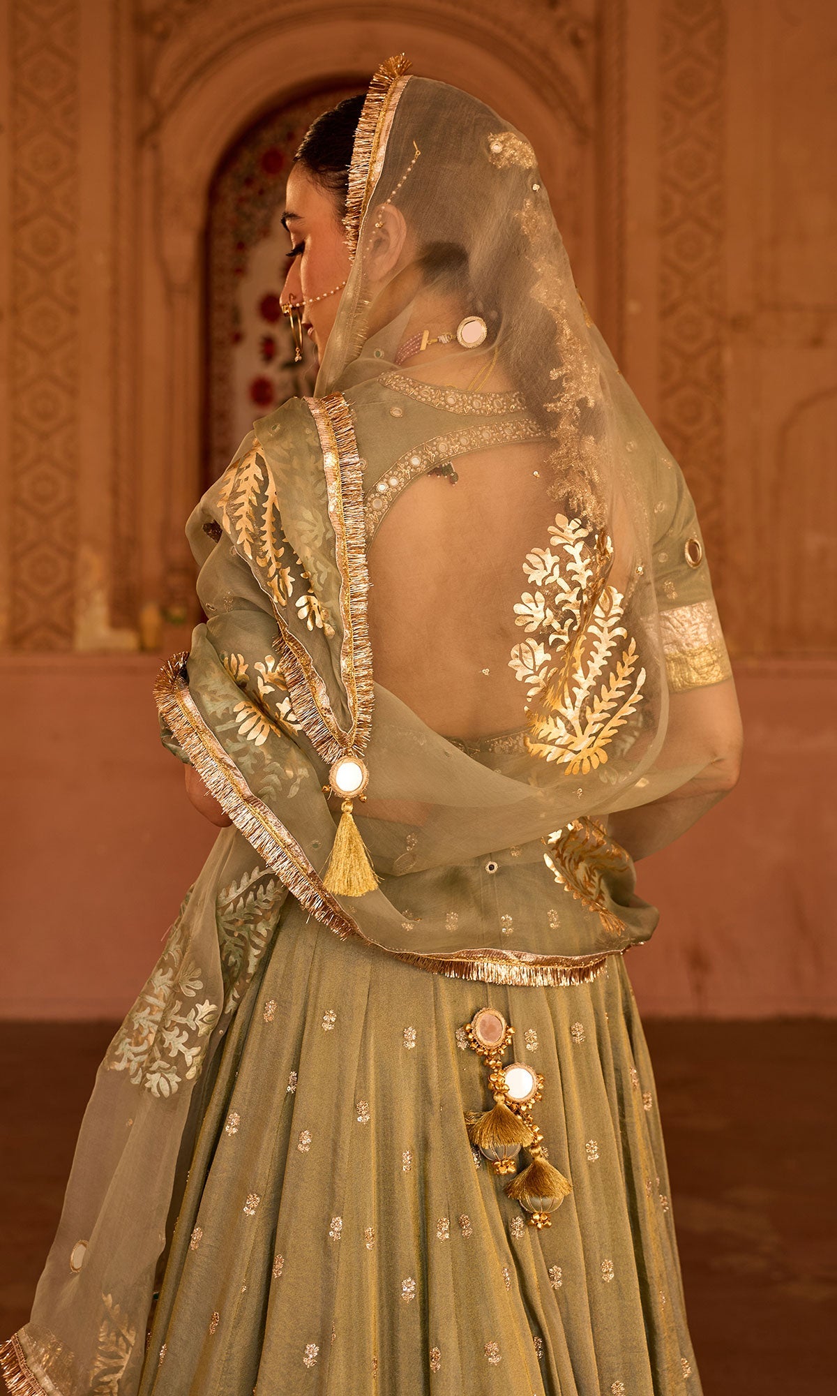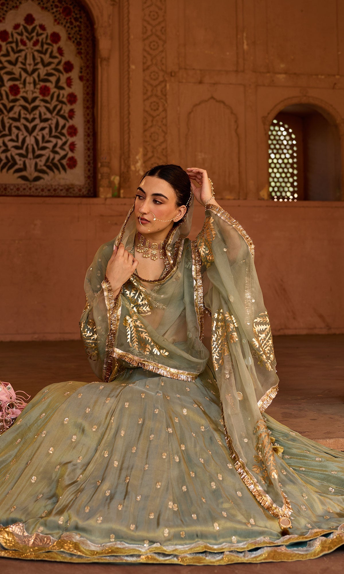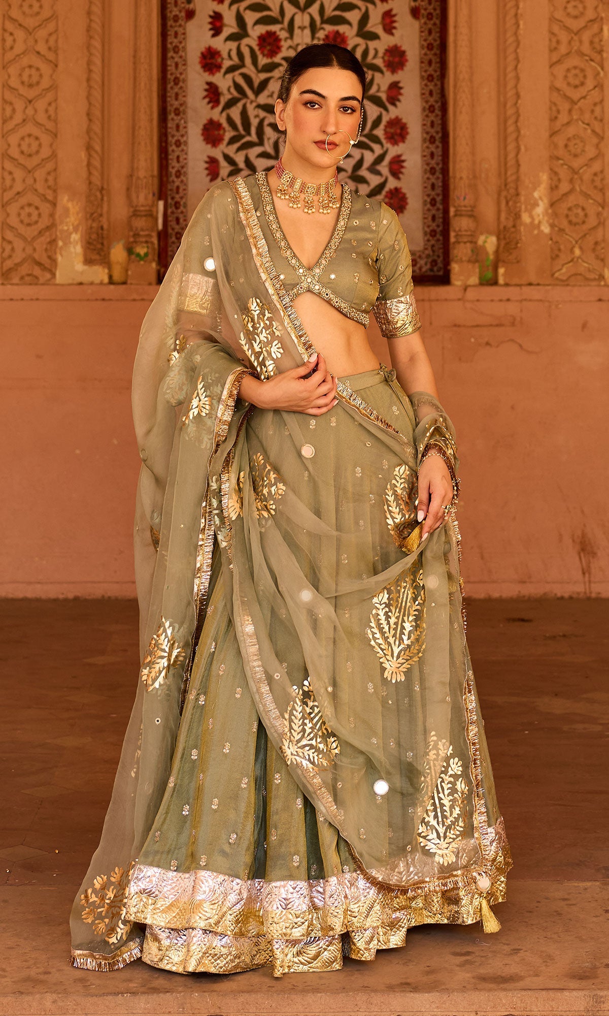 - FABRIC USED: Lehenga and Blouse- Embroidered Tissue, Lining- Shantoon Dupatta -