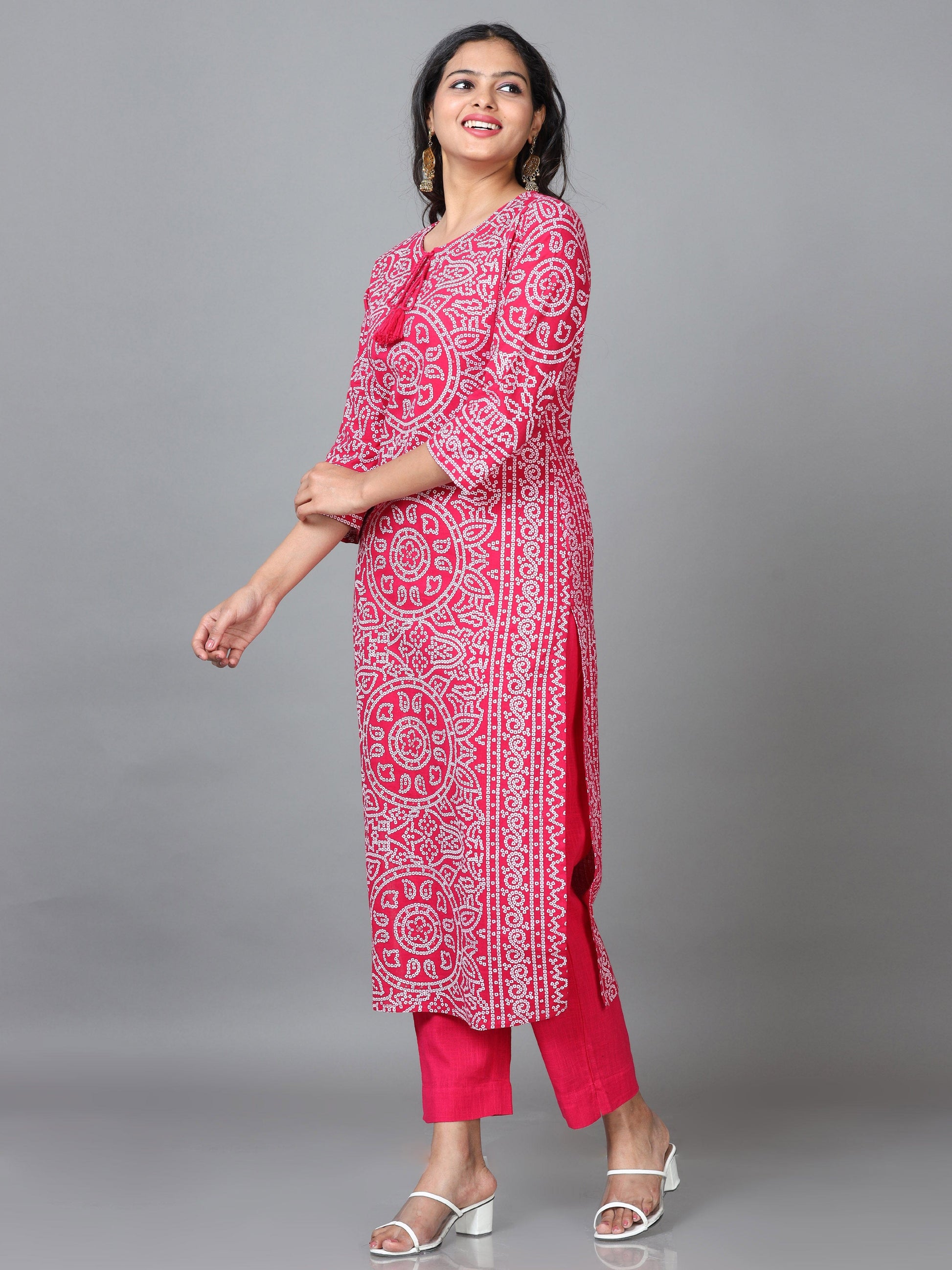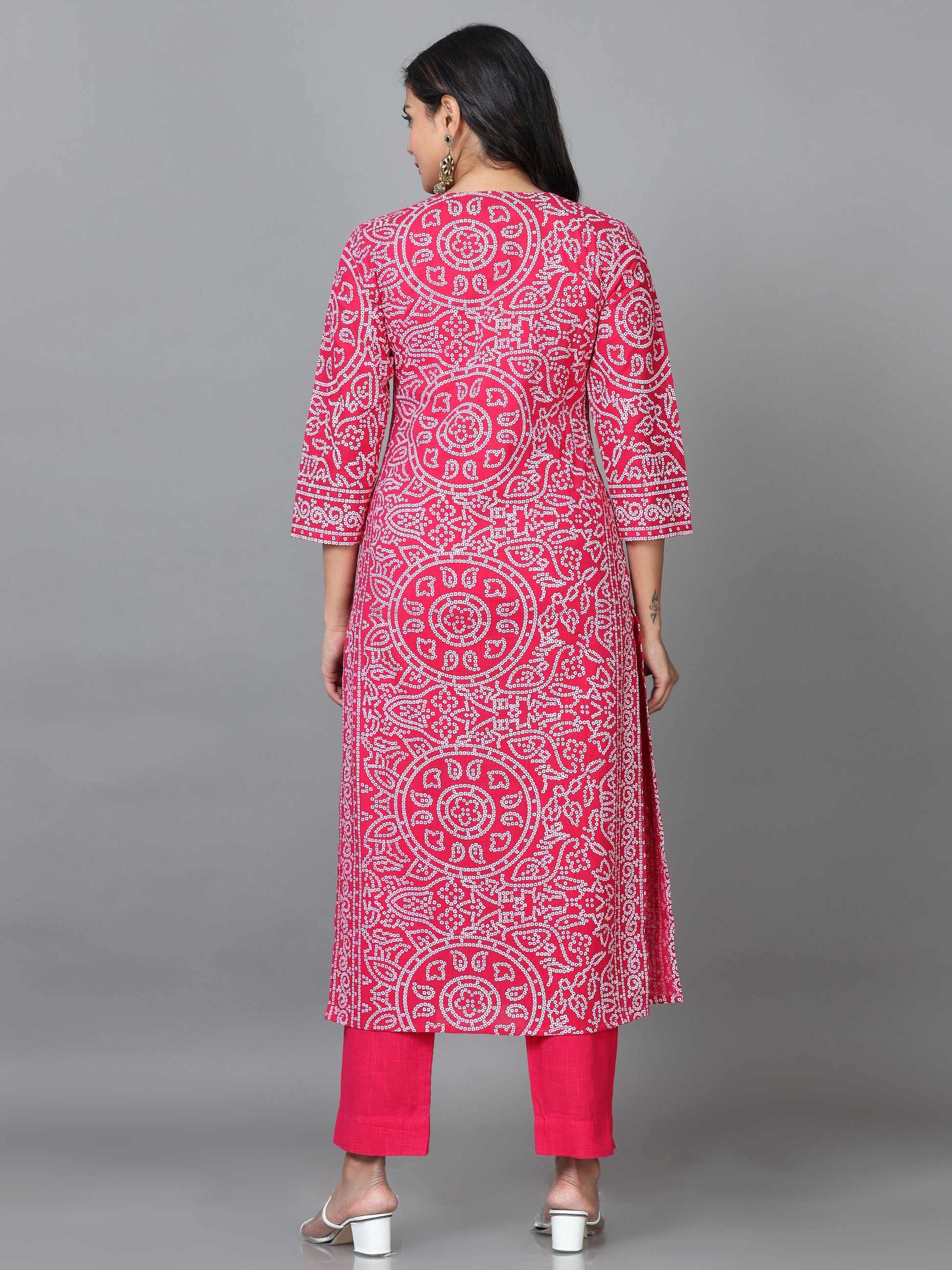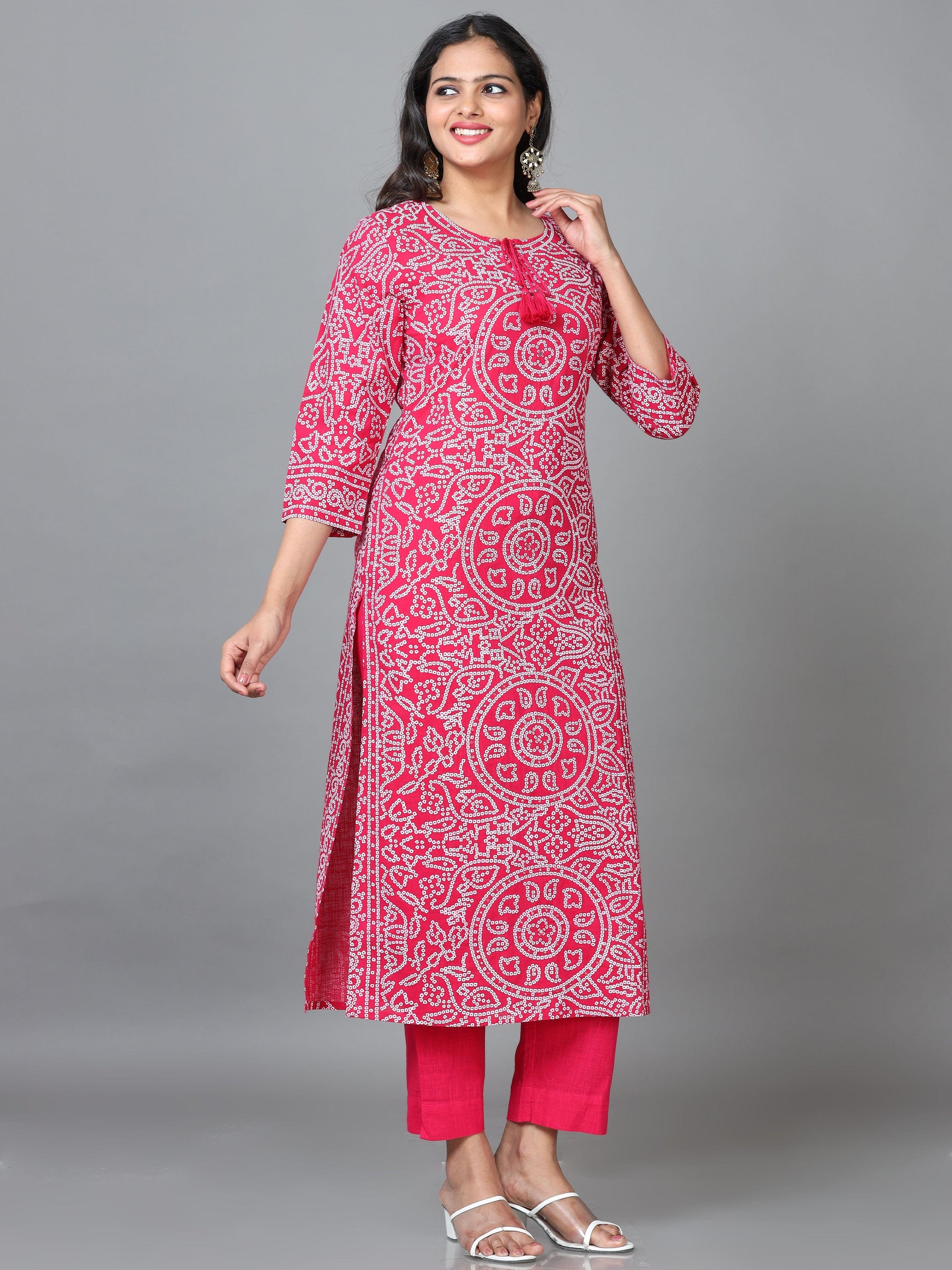 Pink 3/4 Sleeve Cotton Printed Straight calf-long Kurta Set