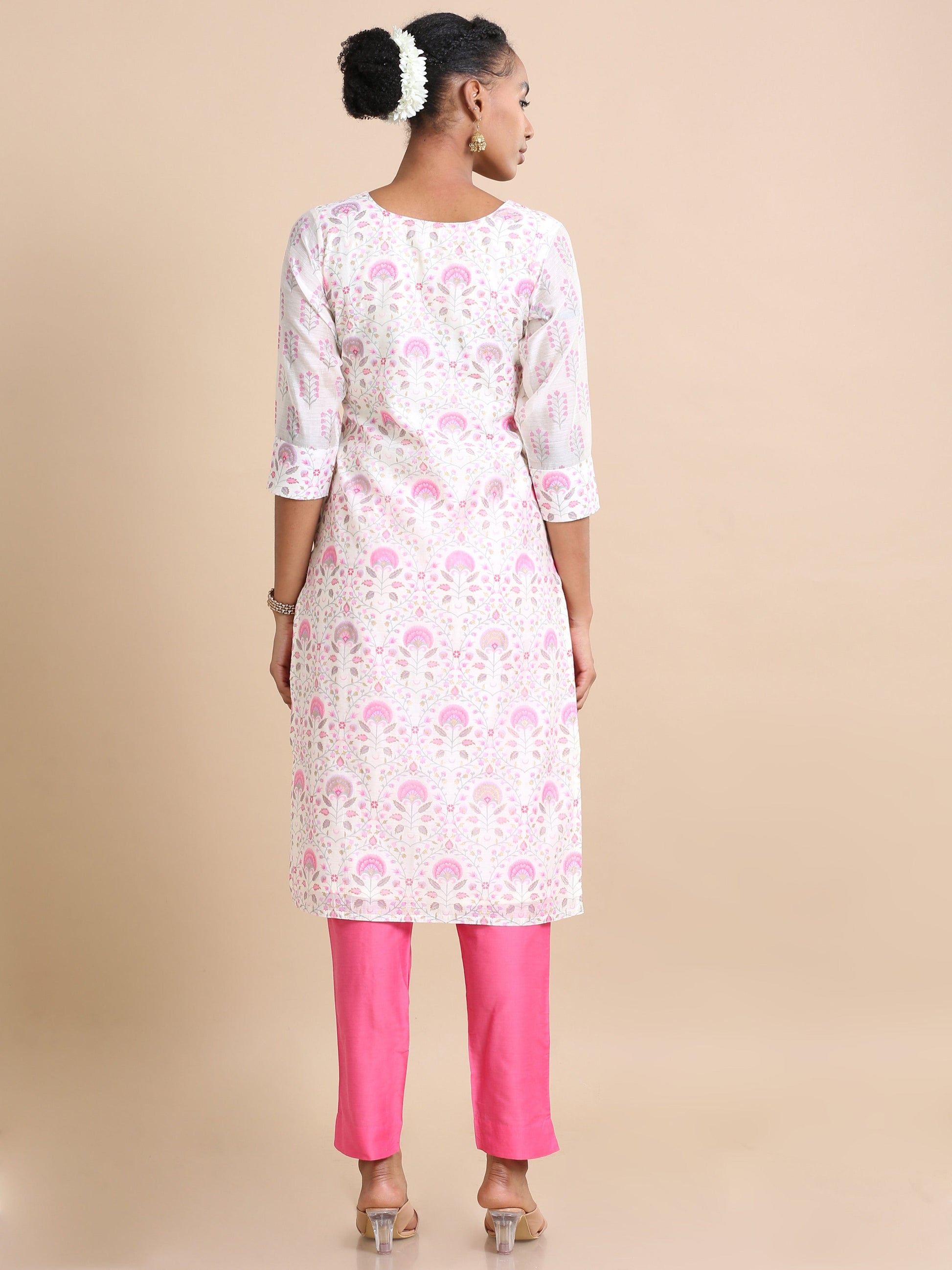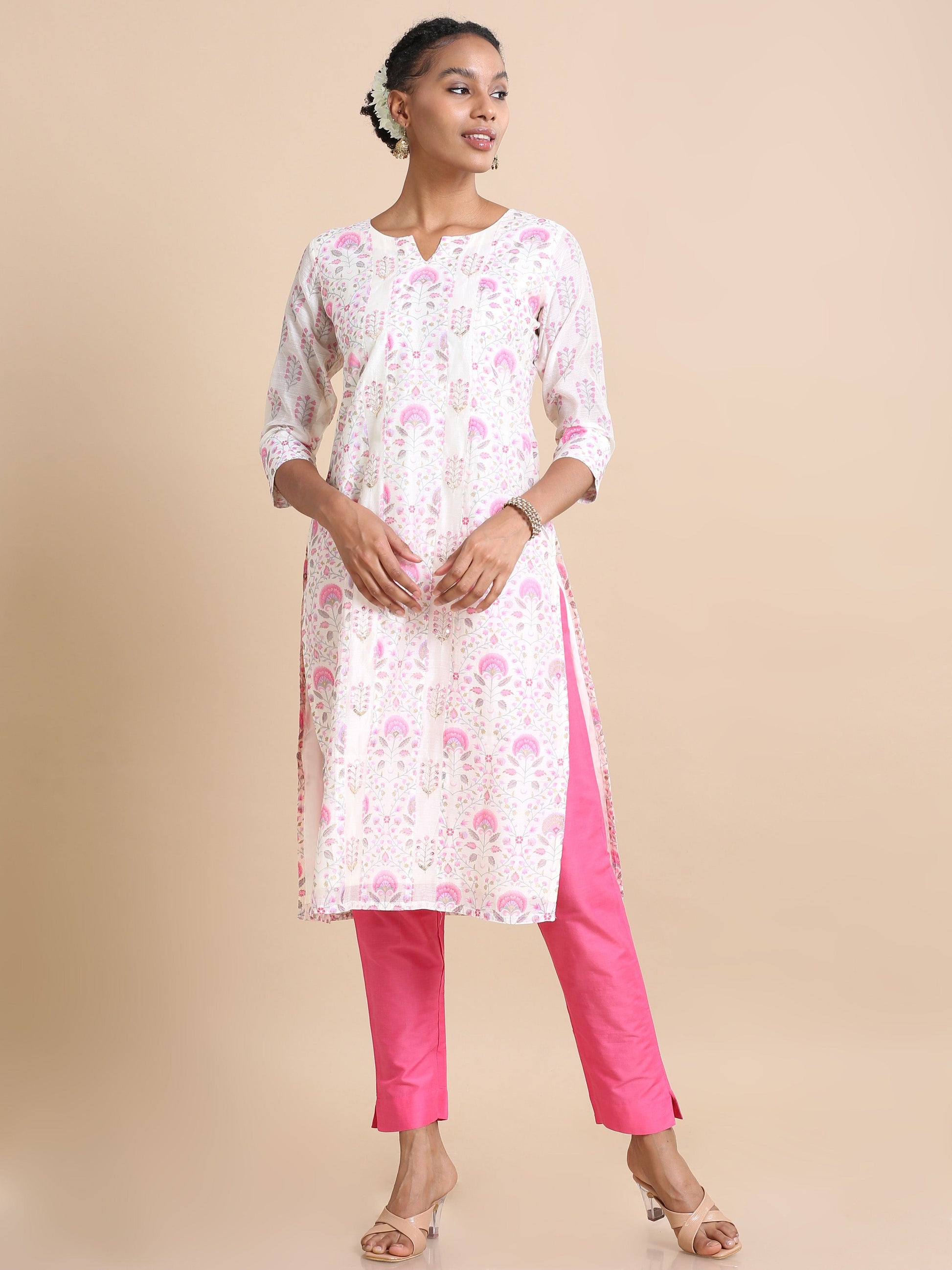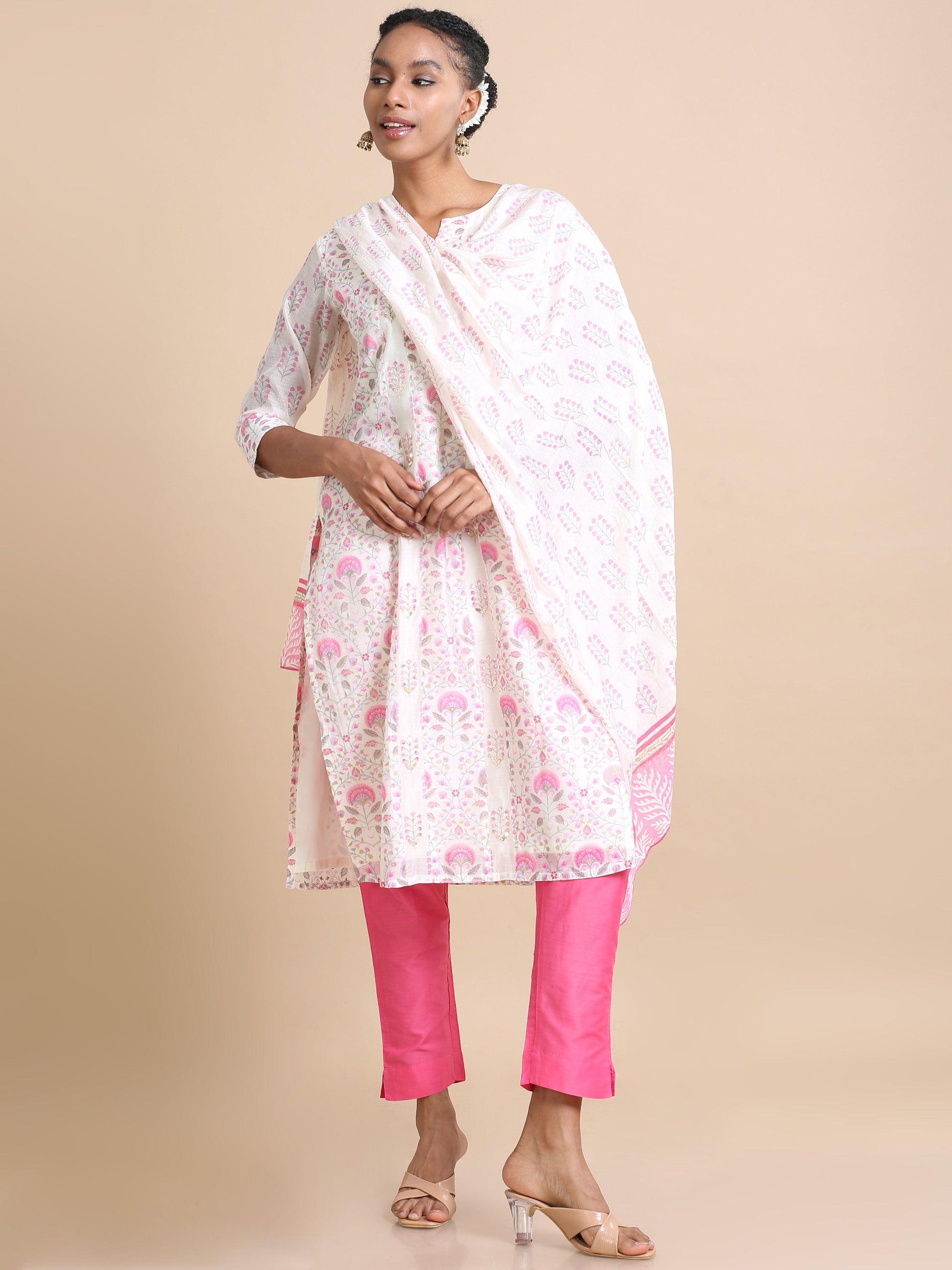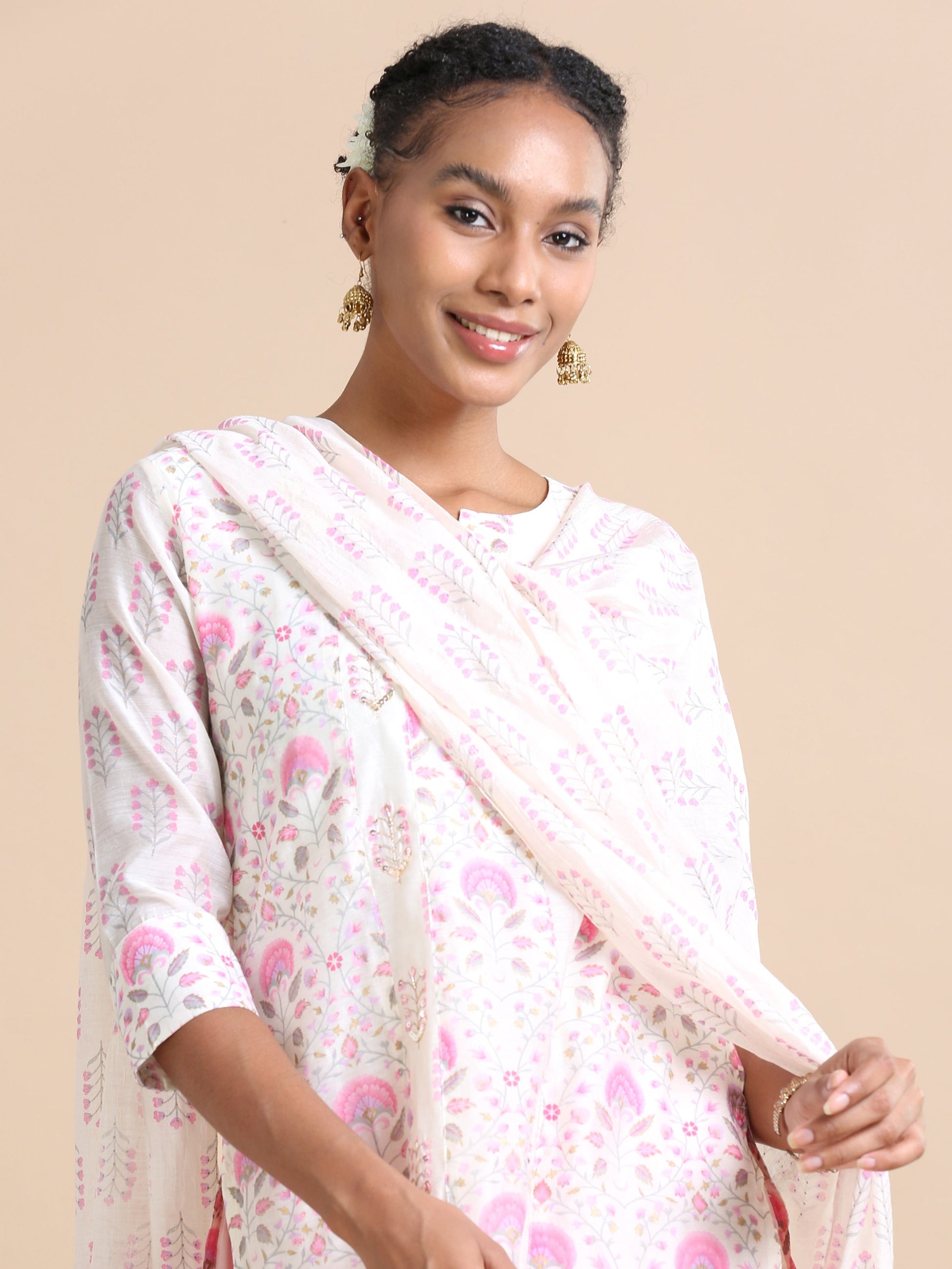 Pink 3/4th sleeves Chanderi Floral print Regular fit Calf length Kurta Set - With Dupatta