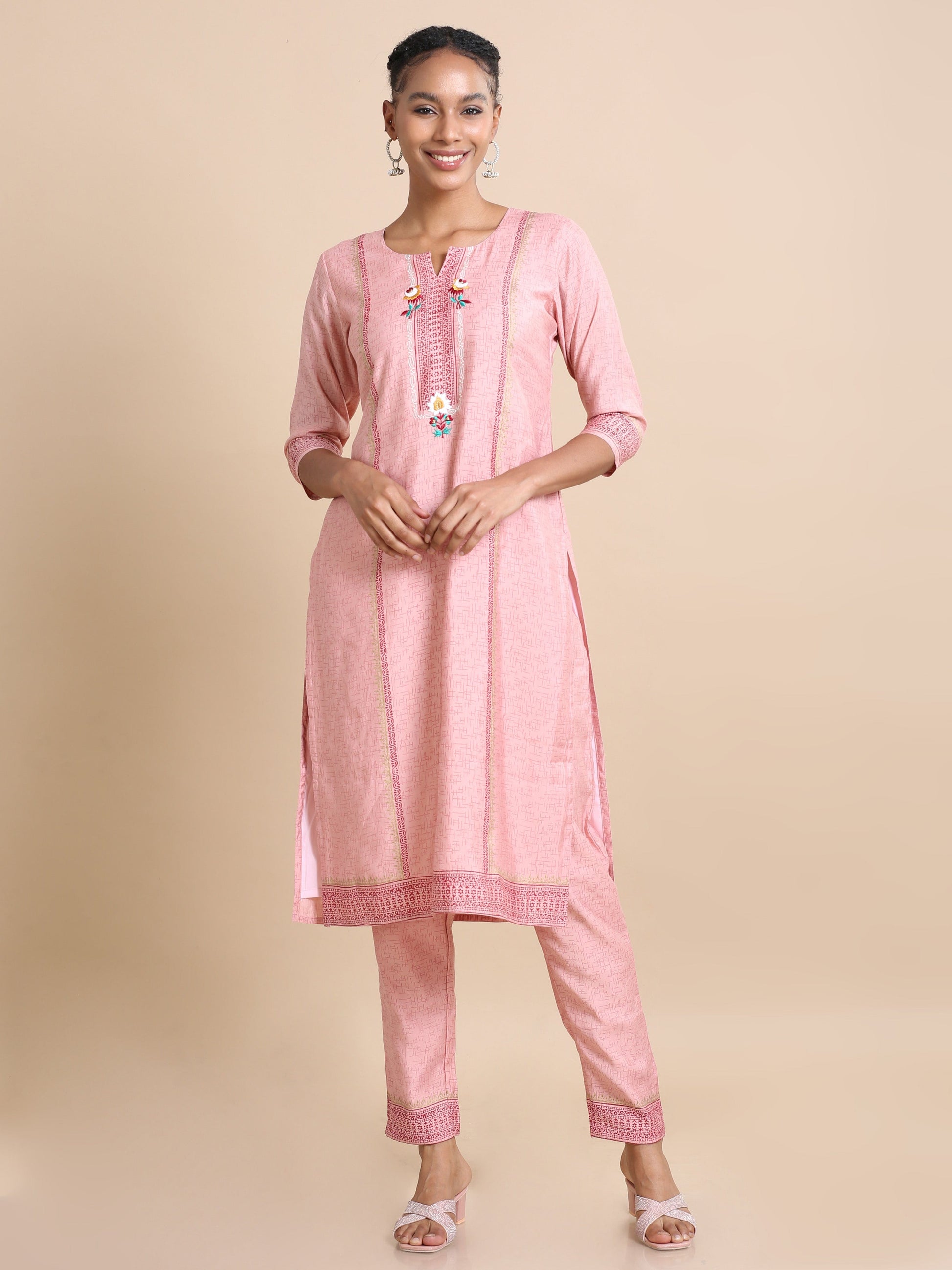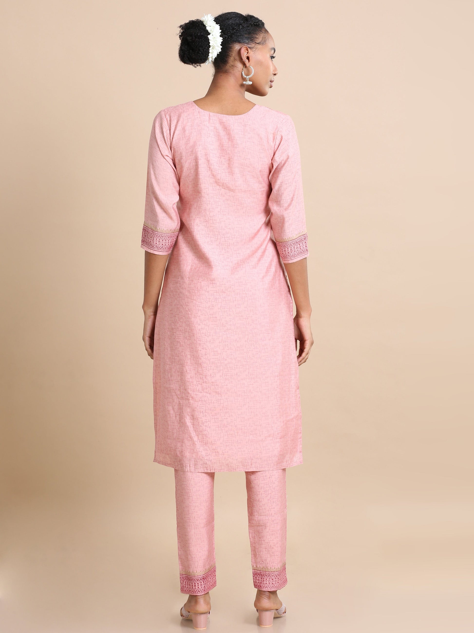 Introducing our Pink Kurta Set from the Festive Collection, a mesmerizing ensemble designed to add elegance to your festive wardrobe. The kurta, fashioned from luxurious Chanderi silk, is a pull-on style adorned with intricate thread work. Featuring a regular fit and calf length, the midi kurta boasts a round neck, 3/4th sleeves, and a side slit, offering a perfect combination of grace and style. The straight silhouette is enhanced with a captivating combination of block print and thread work, creating a distinctive and festive look.Complementing the kurta is our Pink Pants, also crafted from Chanderi silk with matching block print. These pants provide a regular fit, ankle length, pull-on style, mid-rise, and an elastic waist for comfort. The Chanderi silk material of the pants harmonizes with the kurta, resulting in a coordinated and graceful outfit.a Pink Block Print Dupatta in Chanderi silk adds a finishing touch, bringing sophistication to the overall look.Elevate your festive attire with this Pink Kurta Set, featuring the luxurious touch of Chanderi silk, intricate thread work, and a harmonious blend of traditional and contemporary design.
