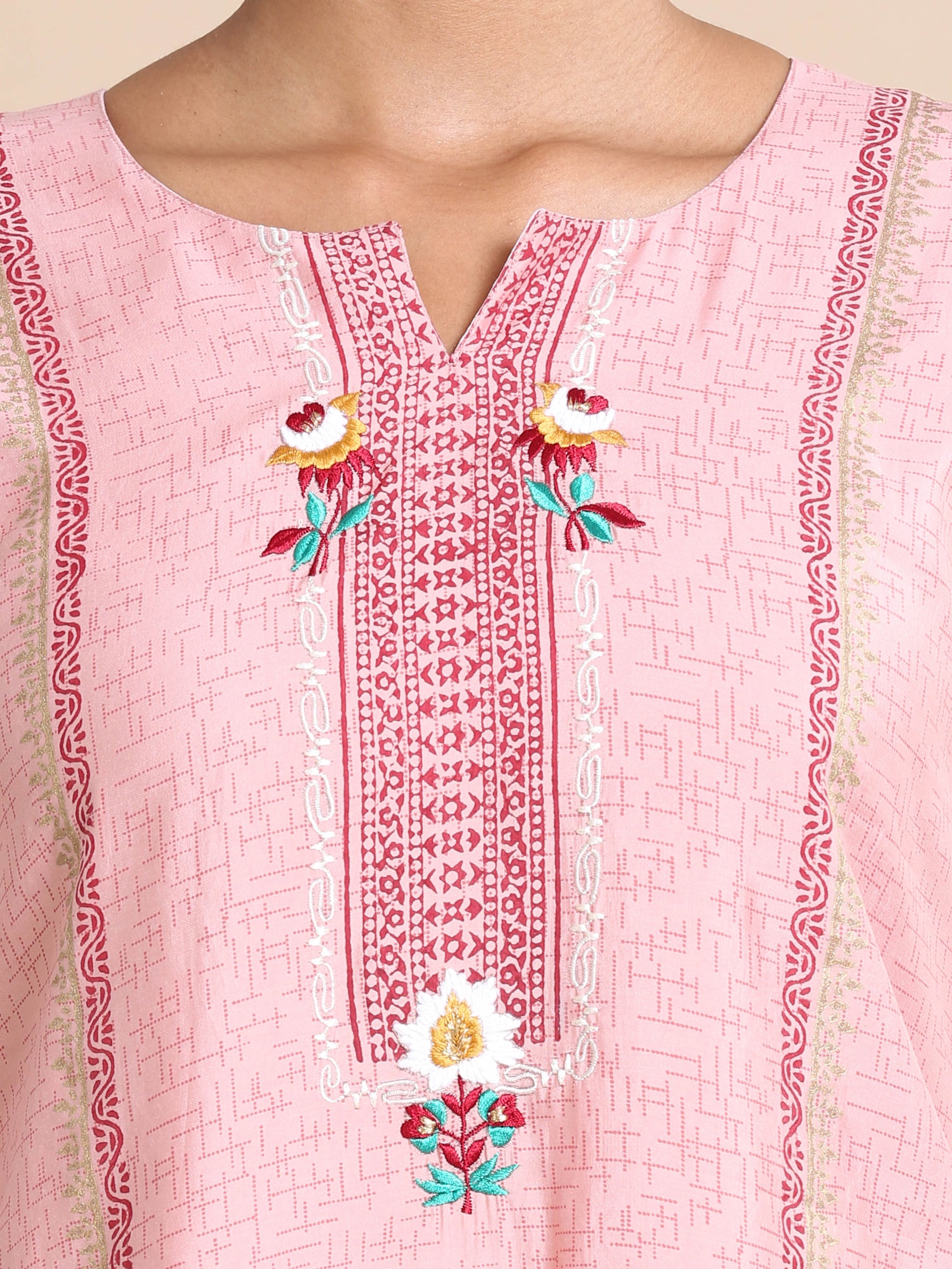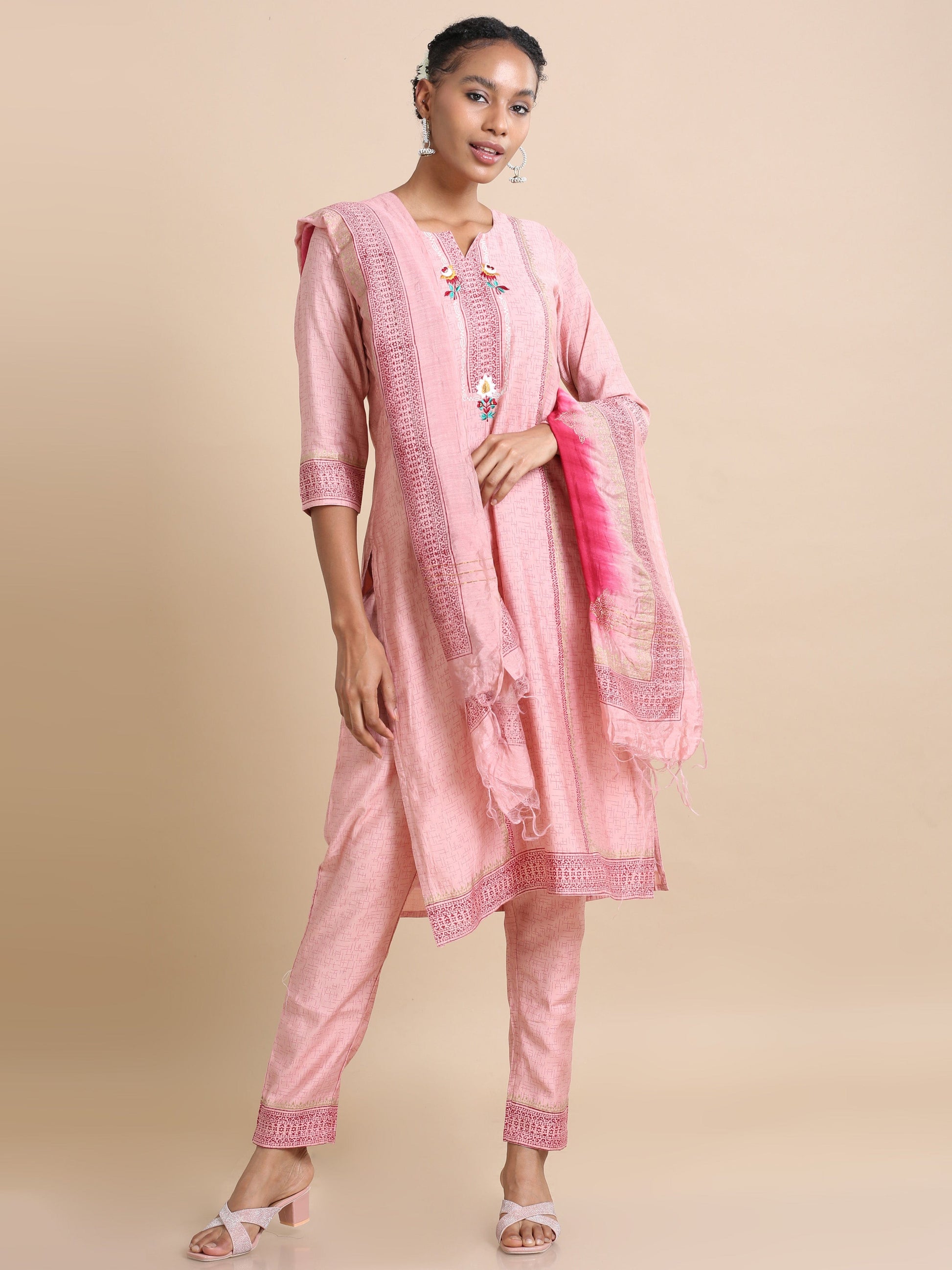 Pink 3/4th sleeves Chanderi silk Block print and thread work Regular fit Calf length Kurta Set - With Dupatta