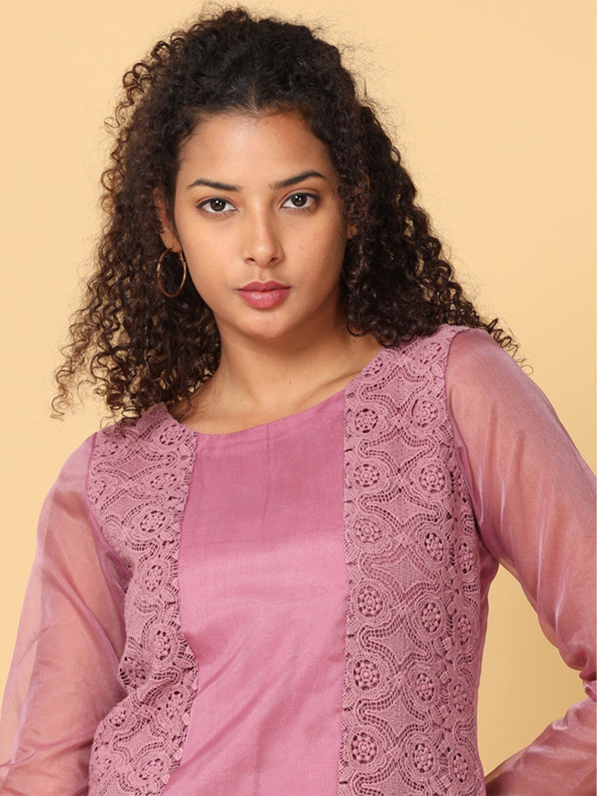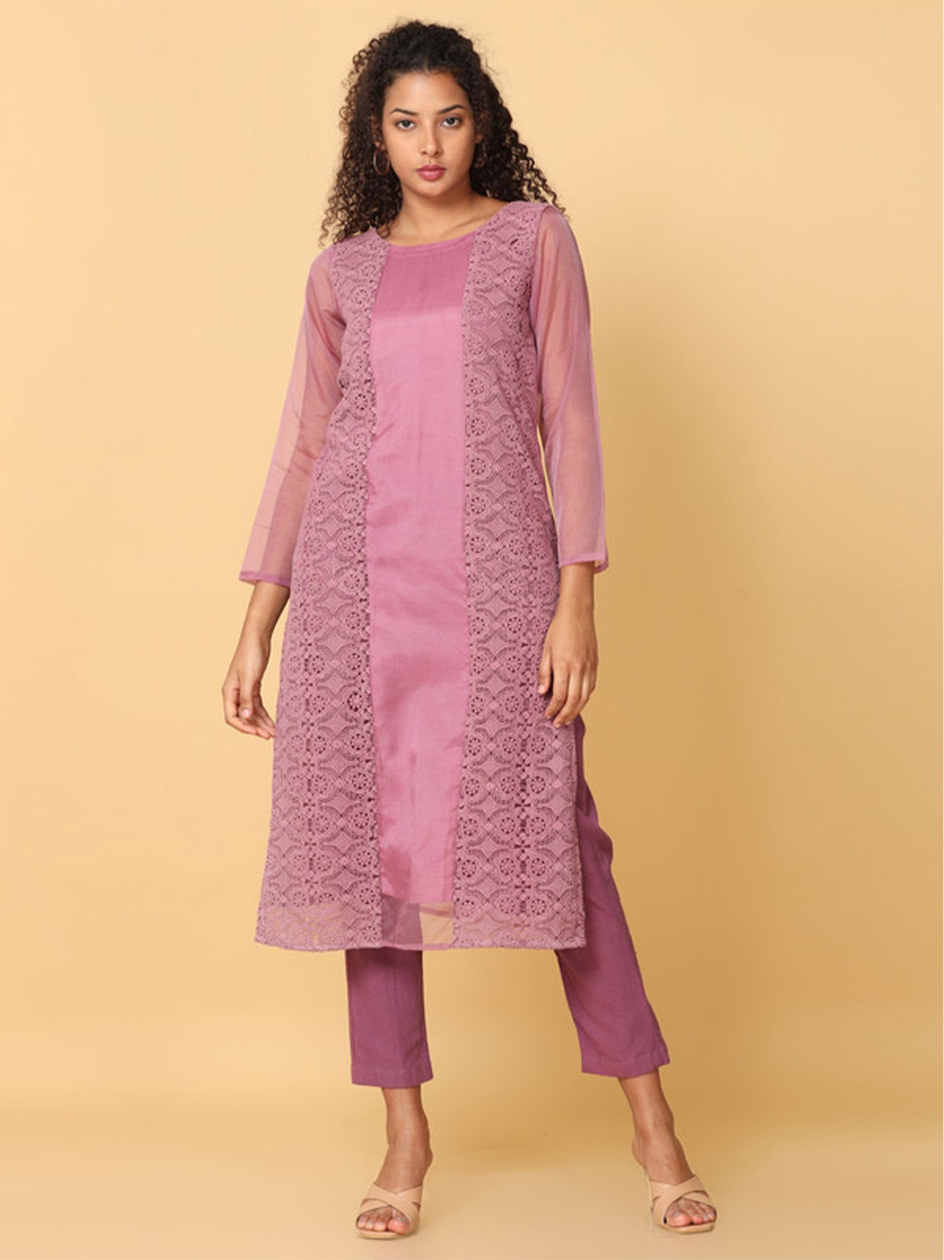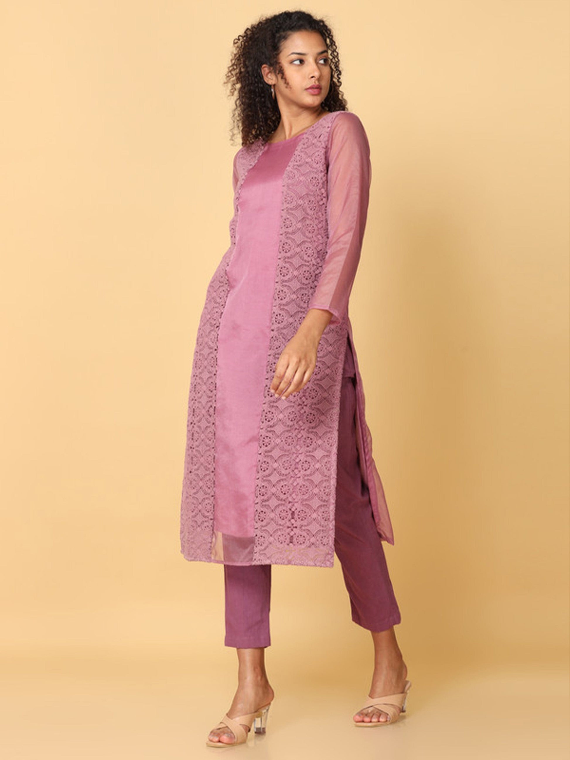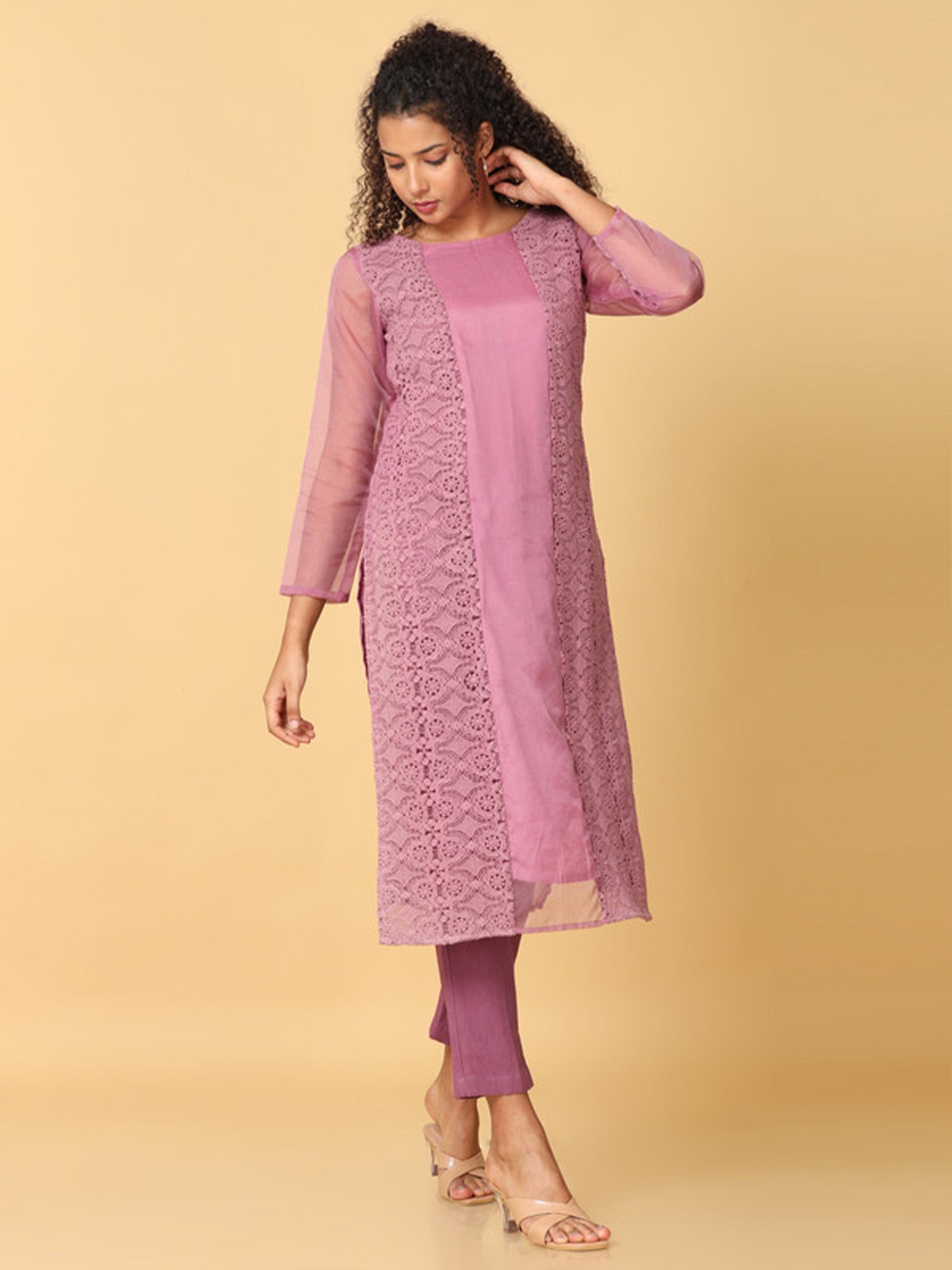 Pink 3/4th Sleeves Organza Solid Regular Calf Length Boat Neck Kurta Set -Without Dupatta