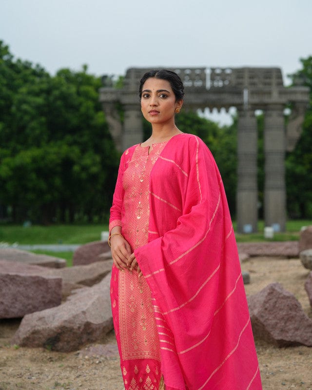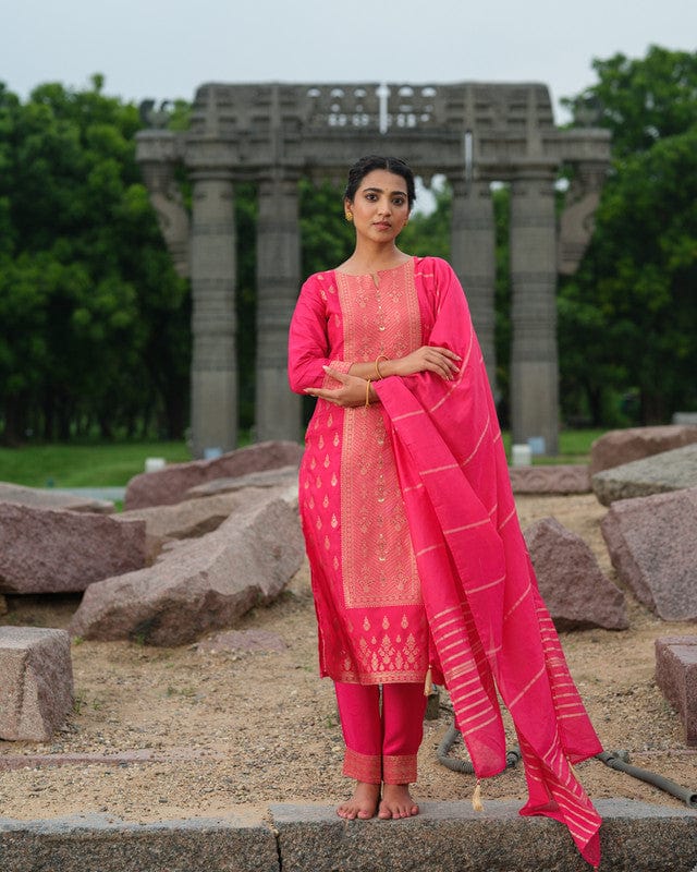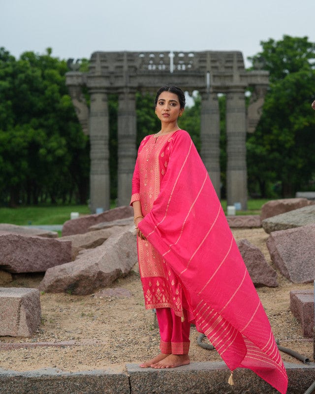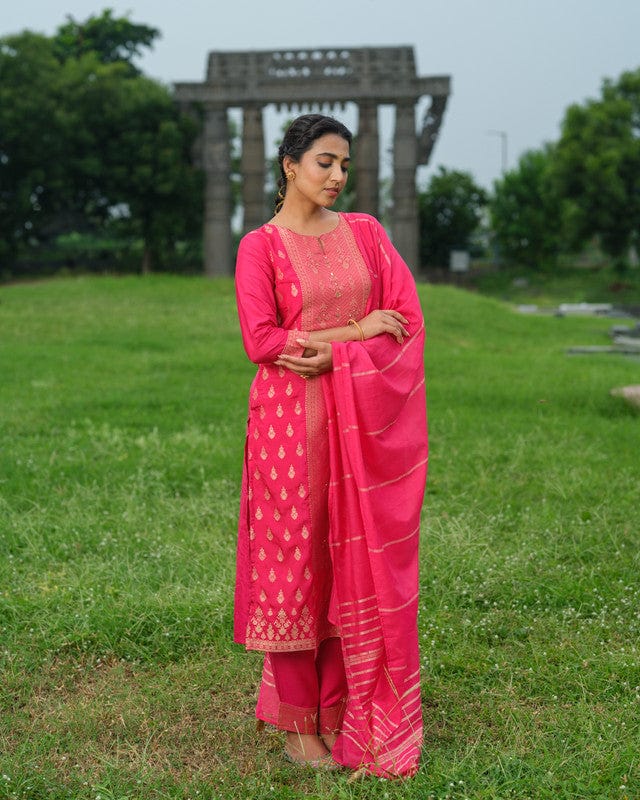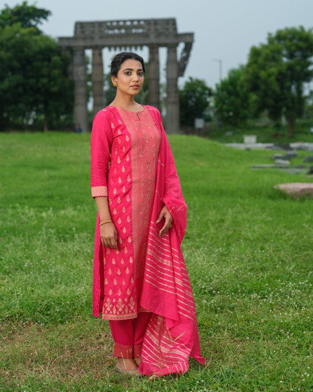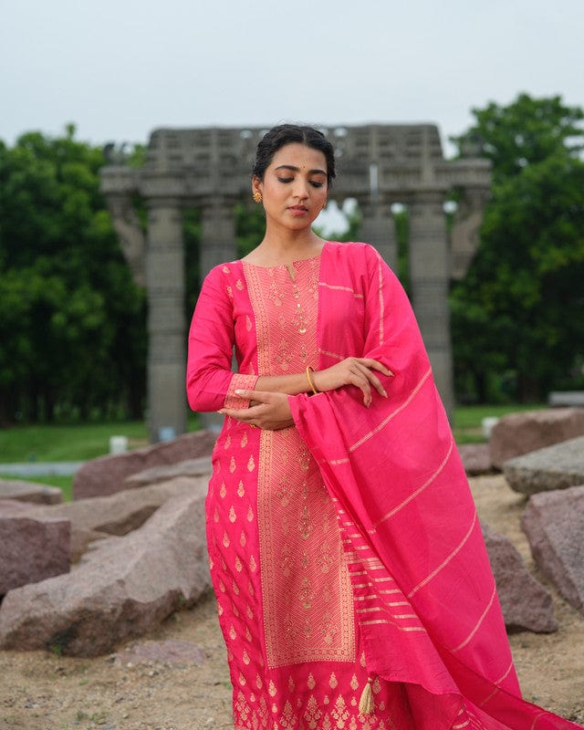 Pink 3/4th Sleeves Traditional motifs with embellishment work Banaras Calf length Kurta Set - With Dupatta