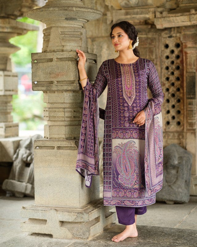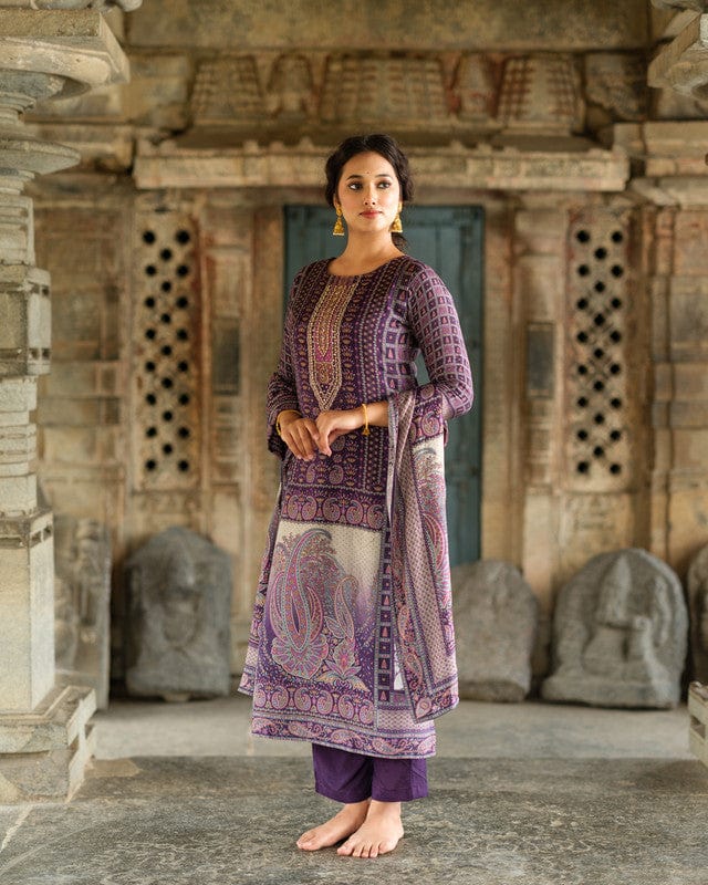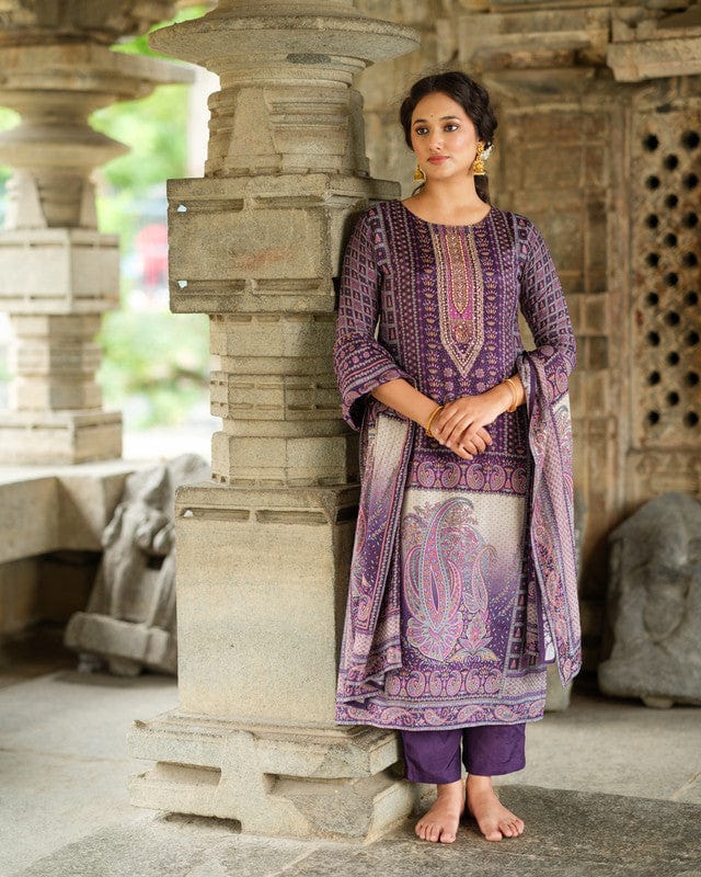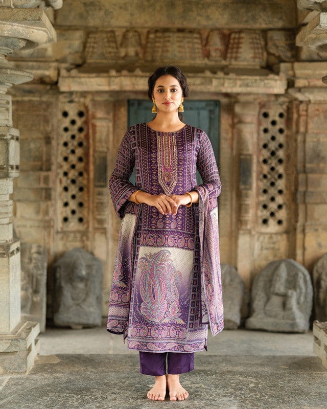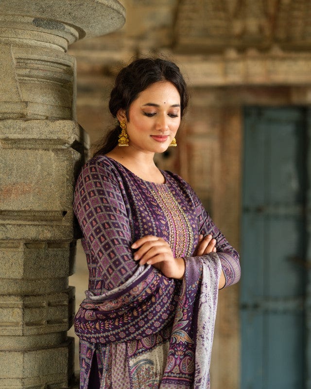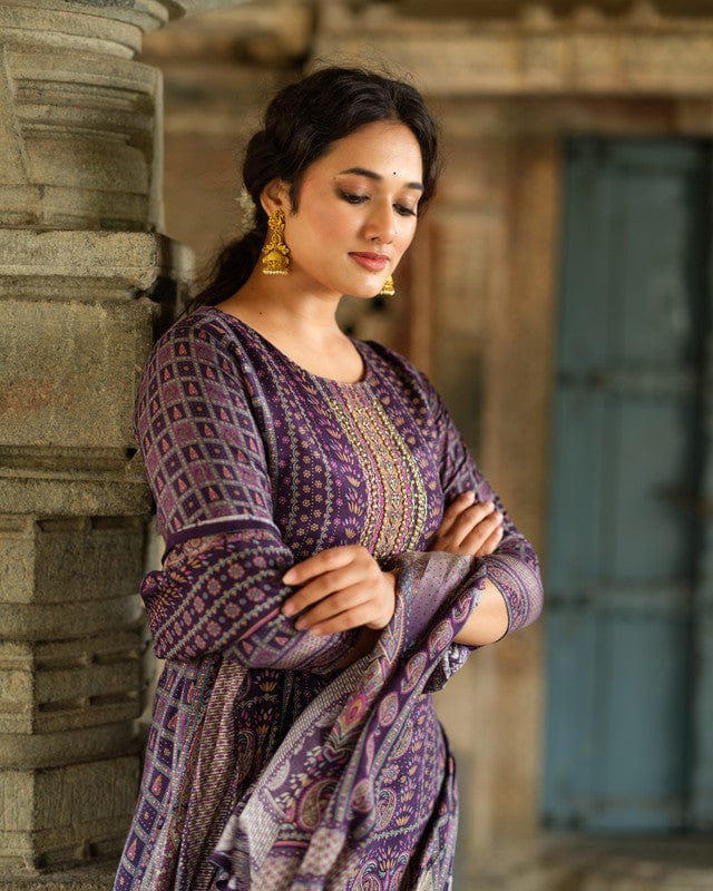 Purple 3/4th Sleeves All over floral print Modal Silk Calf length Kurta Set - With Dupatta