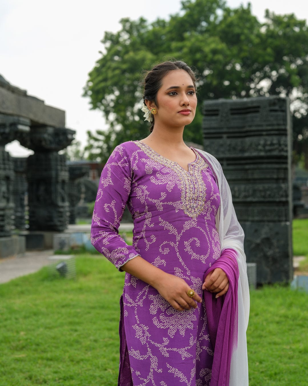 Purple 3/4th Sleeves Bandhini Silk Calf length Kurta Set - With Dupatta