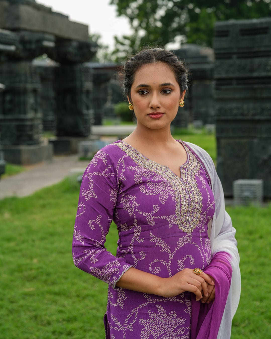 This purple silk kurta set from the Kala Thoranam collection is perfect for special occasions. The kurta features a V-neckline, bandhani pattern, and delicate thread work, with a straight, calf-length cut and 3/4th sleeves. Side slits add a touch of elegance. The set includes matching purple silk ankle-length pants with a mid-rise elasticated back for comfort. A ombre chiffon dupatta completes the look, creating a harmonious blend of tradition and style.