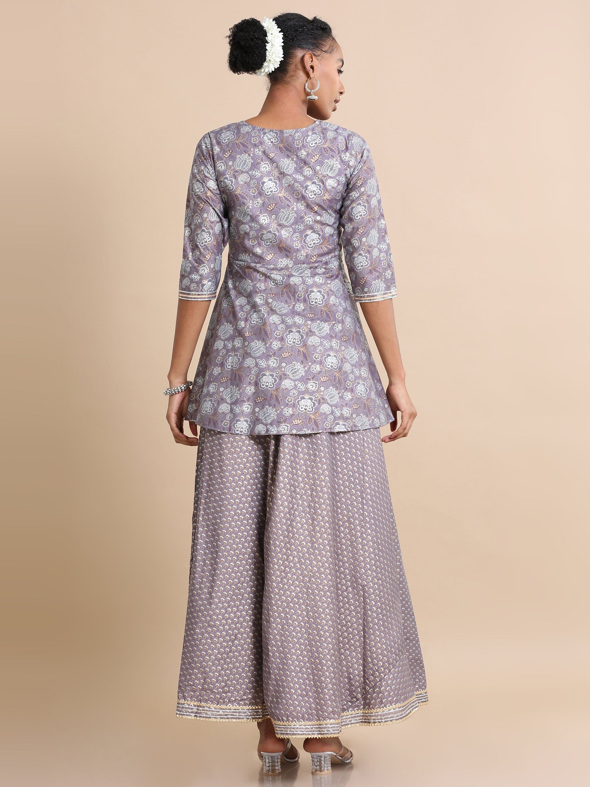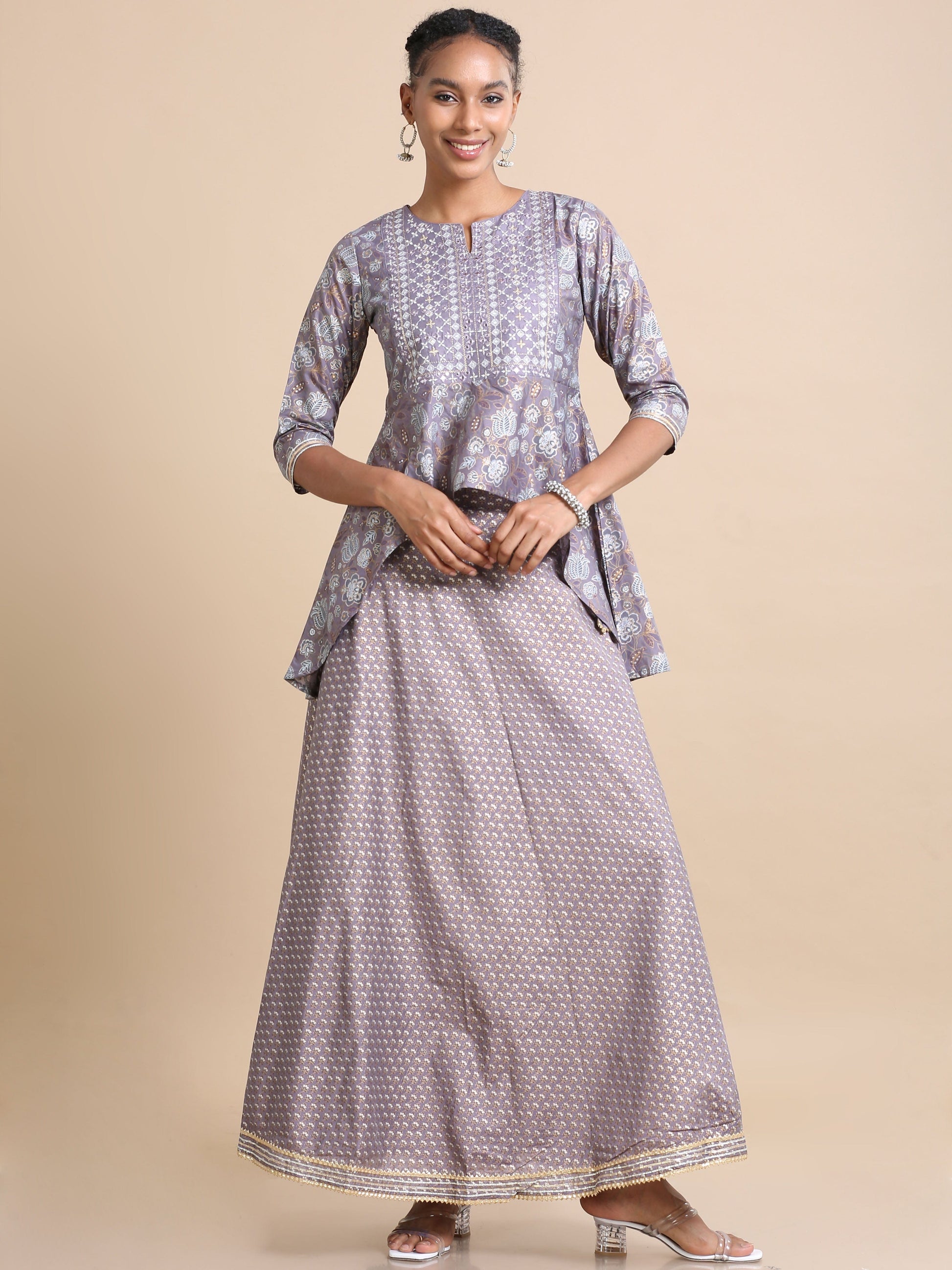 This purple kurta set is part of a festive collection and features a pull-on style made from Chanderi fabric. The kurta is adorned with mirror work and thread work, showcasing intricate details. The regular-fit kurta has an asymmetrical design, reaching hip length, and features a round neck. It is embellished with mica print, mirror work, and thread work, creating a festive look. The asymmetrical silhouette is complemented by 3/4th sleeves and a regular fit, with no side slits. Care instructions recommend hand wash, gentle wash, and washing light colors separately when paired with the skirt.