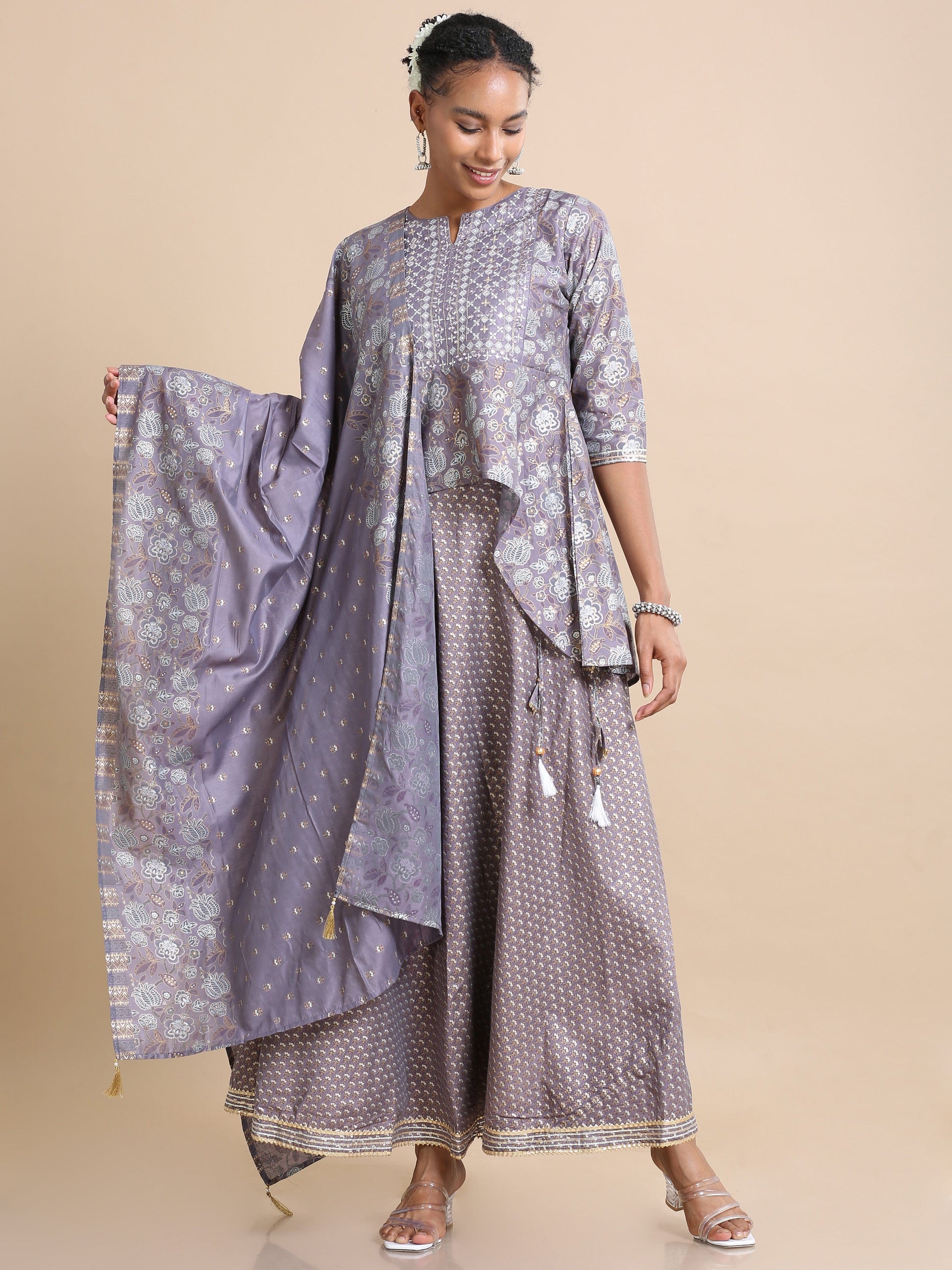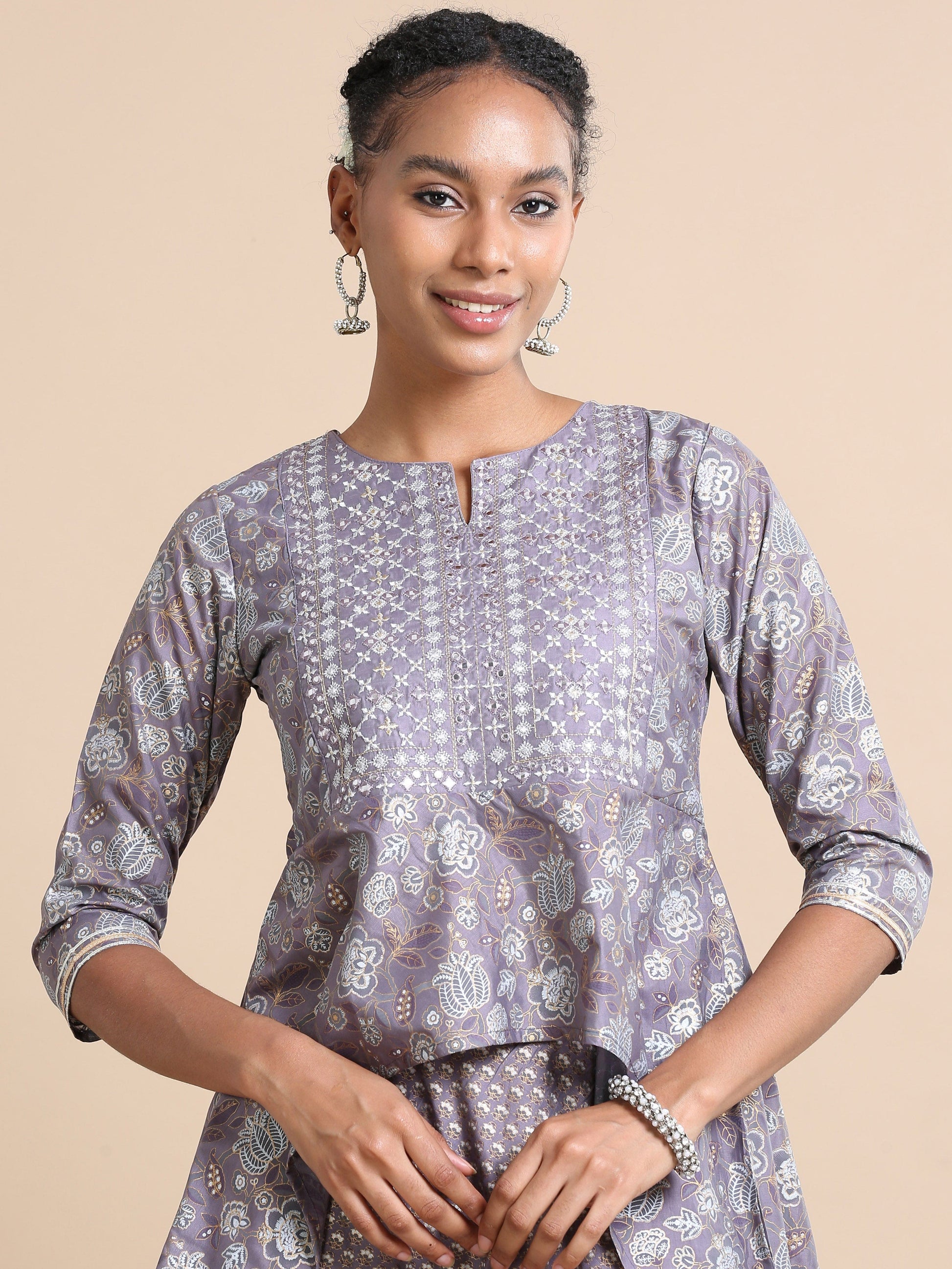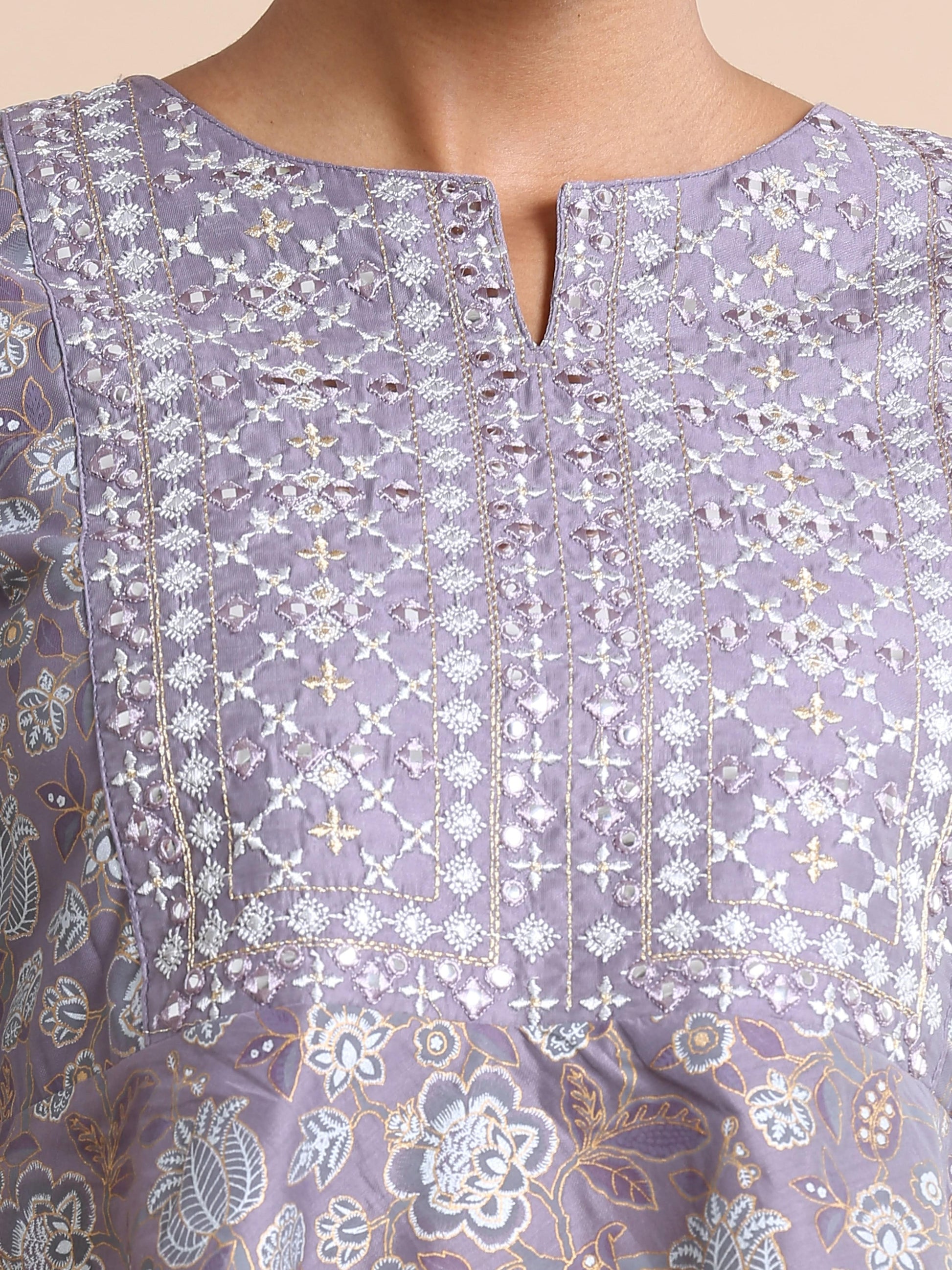 Purple 3/4th sleeves Chanderi Mica print, mirror work, thread work Regular fit Hip length Kurta Set - With Dupatta