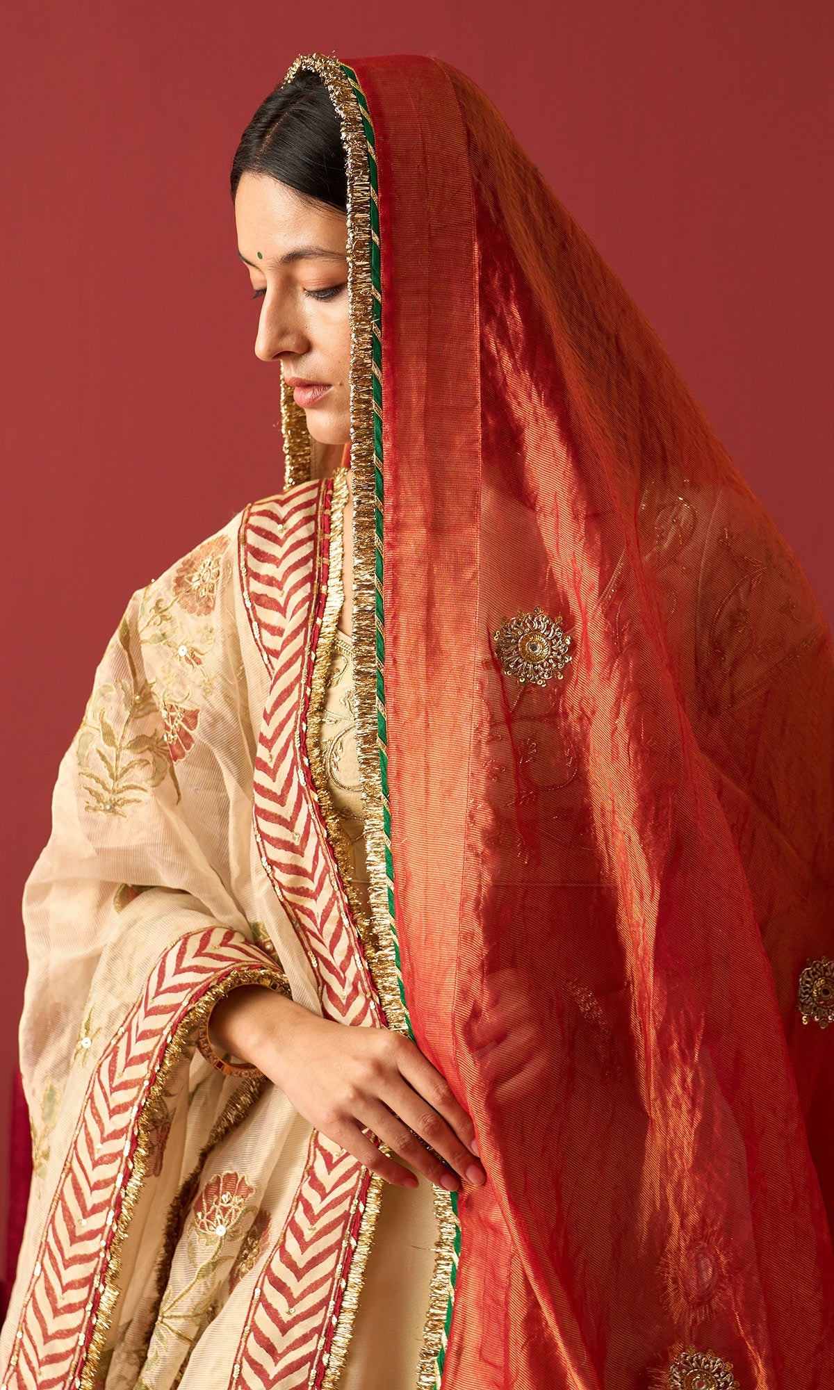 Rangeela Ivory gold Red tissue Mughal block print patch work lehenga with blouse and 2 dupattas ( set of 4)