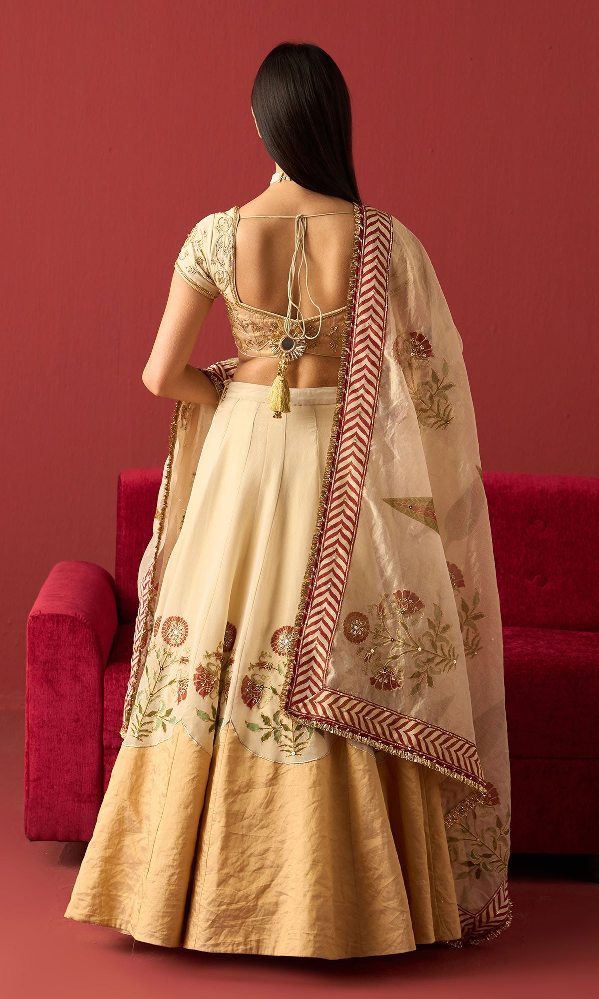 Rangeela Ivory gold Red tissue Mughal block print patch work lehenga with blouse and dupatta ( set of 3)
