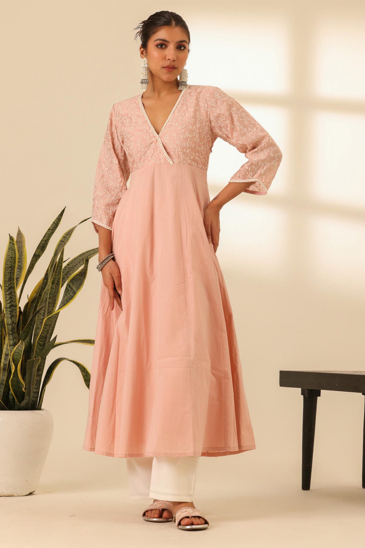 Features a graceful V-Neckline and 3/4th Sleeves for a classic silhouette.