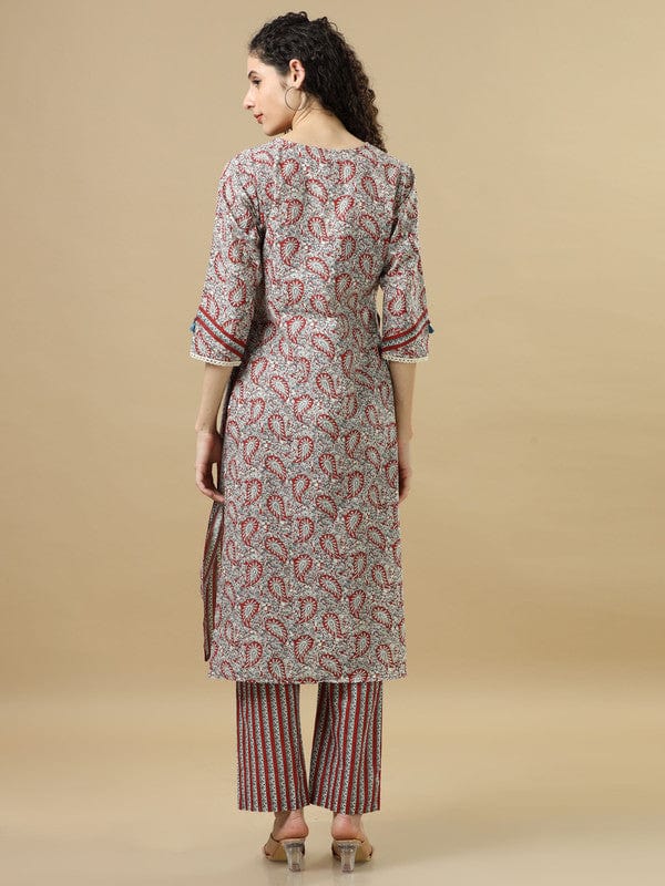 Red 3/4Th Sleeves Cotton Regular Fit Calf Length Straight Kurta Set - With Dupatta