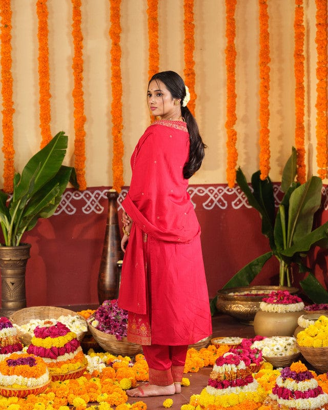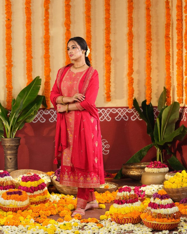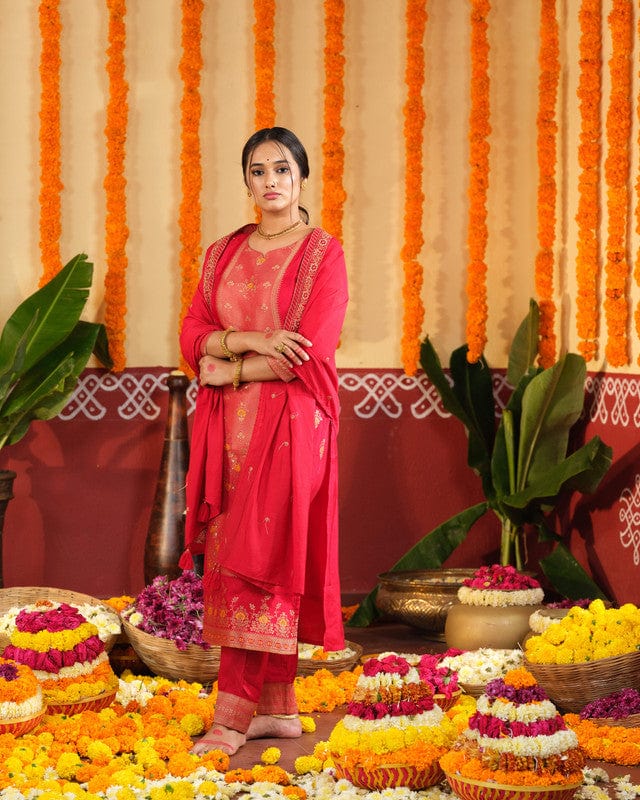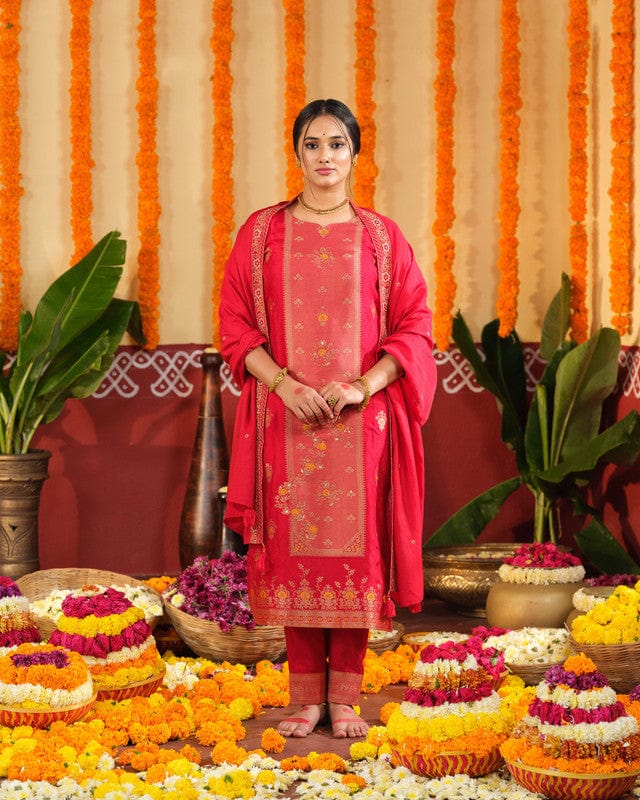 Red 3/4th Slevees Banaras Traditional Motifs Calf Length Kurta Set - With Dupatta