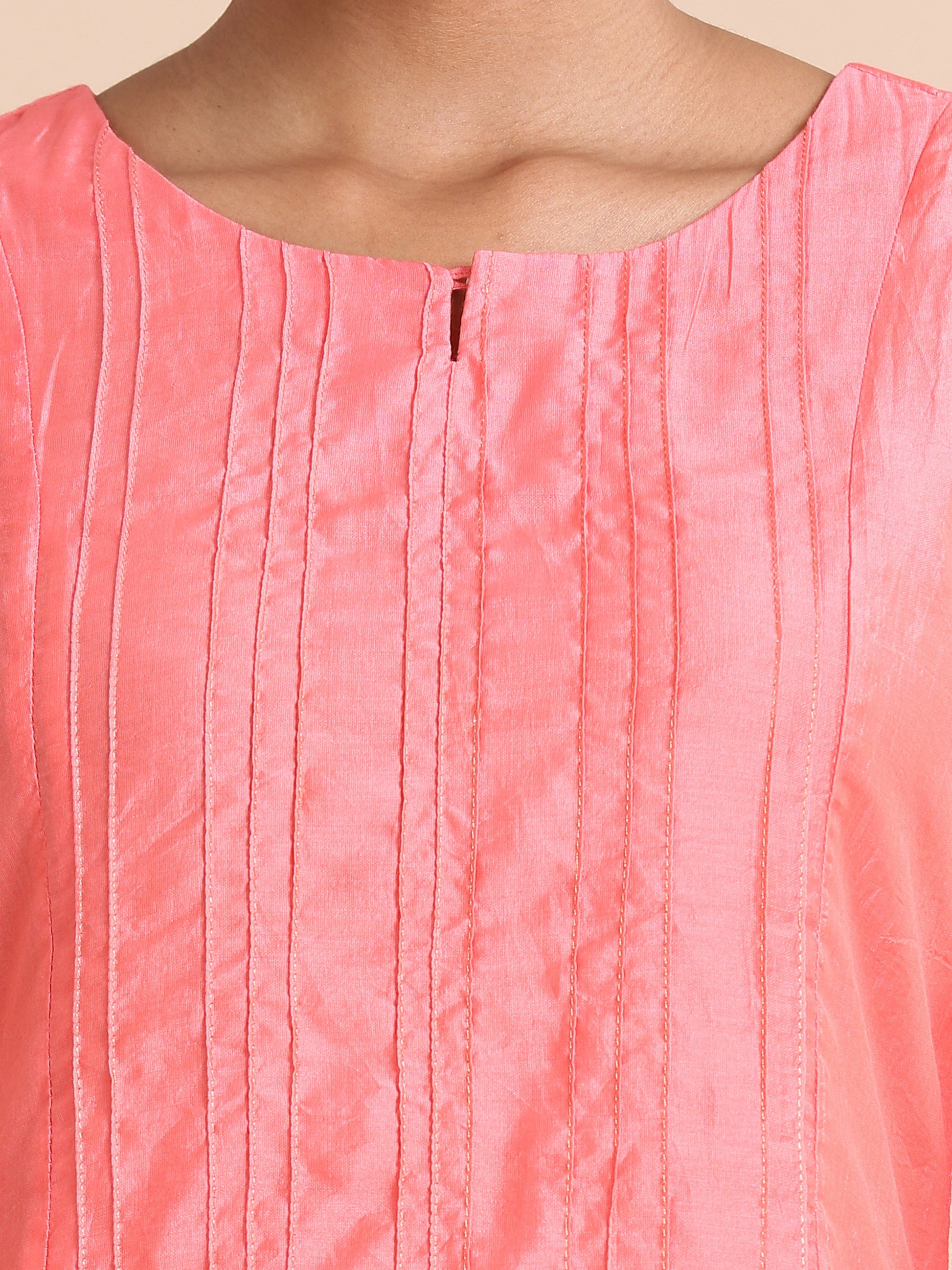 Presenting our Salmon Kurta Set from the Festive Collection, a captivating ensemble designed to enhance your festive wardrobe. The kurta features a keyhole button opening at the front, creating an elegant and unique look. Crafted from Cotton Silk, it boasts intricate thread work at the front, adding a touch of sophistication. With a regular fit and calf length, the midi kurta showcases a round neck with a keyhole, elbow sleeves, and side slits, making it an ideal choice for festive wear.Complementing the kurta is our Salmon Pants, made from solid Cotton Silk. These pants offer a regular fit, ankle length, pull-on style, mid-rise, and an elastic waist for comfort. The Chanderi Salmon Banarasi Dupatta adds a luxurious and festive touch, completing the coordinated look.For proper care, we recommend hand washing this set with a gentle touch. Additionally, washing light colors separately is advisable to maintain the vibrancy of the garments.
