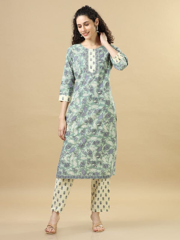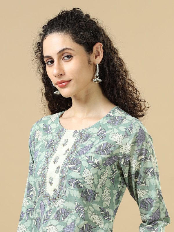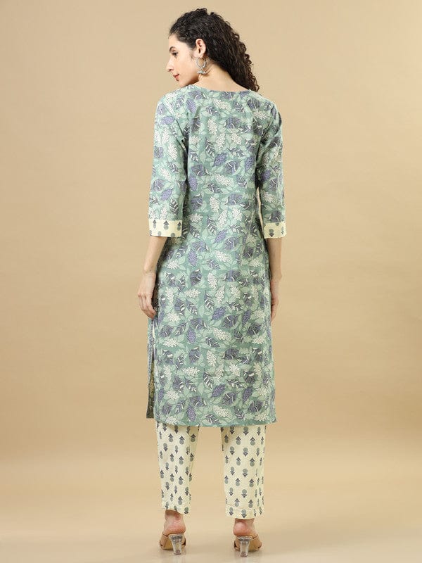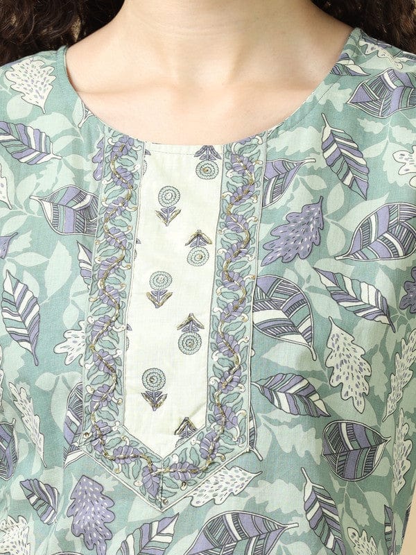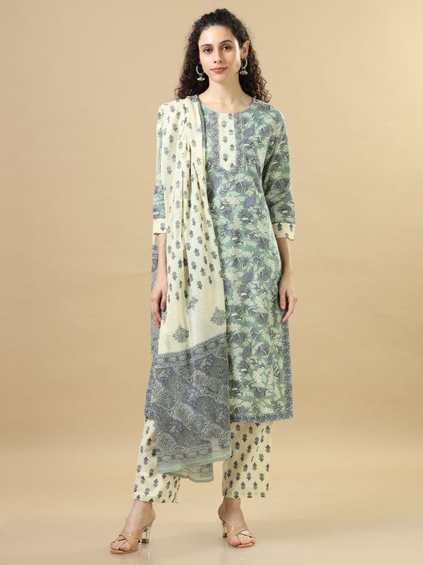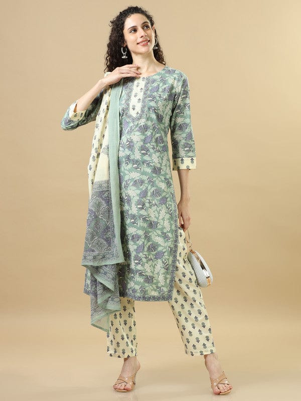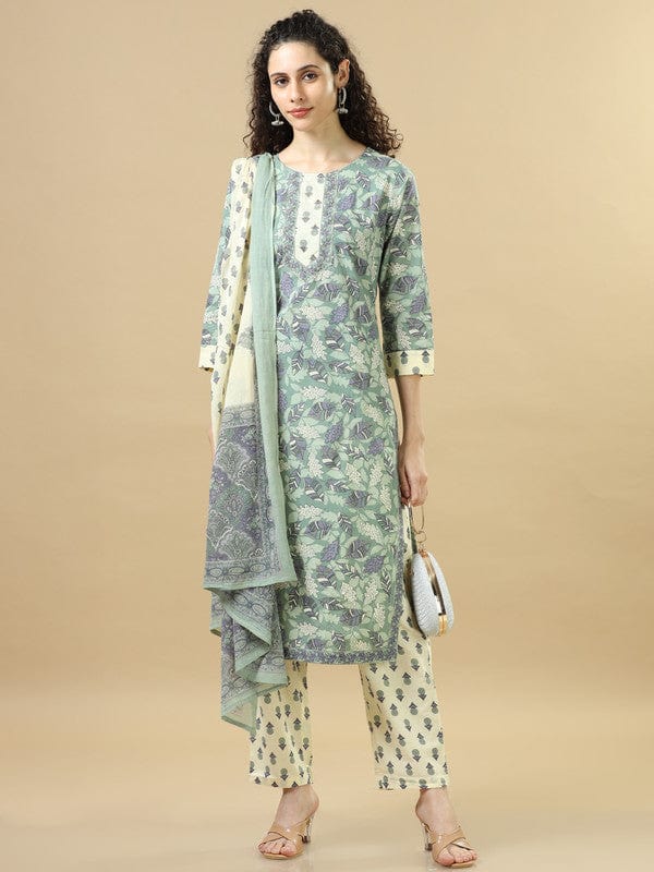 Sea Green 3/4Th Sleeves Cotton Regular Fit Calf Length Straight Kurta Set - With Dupatta