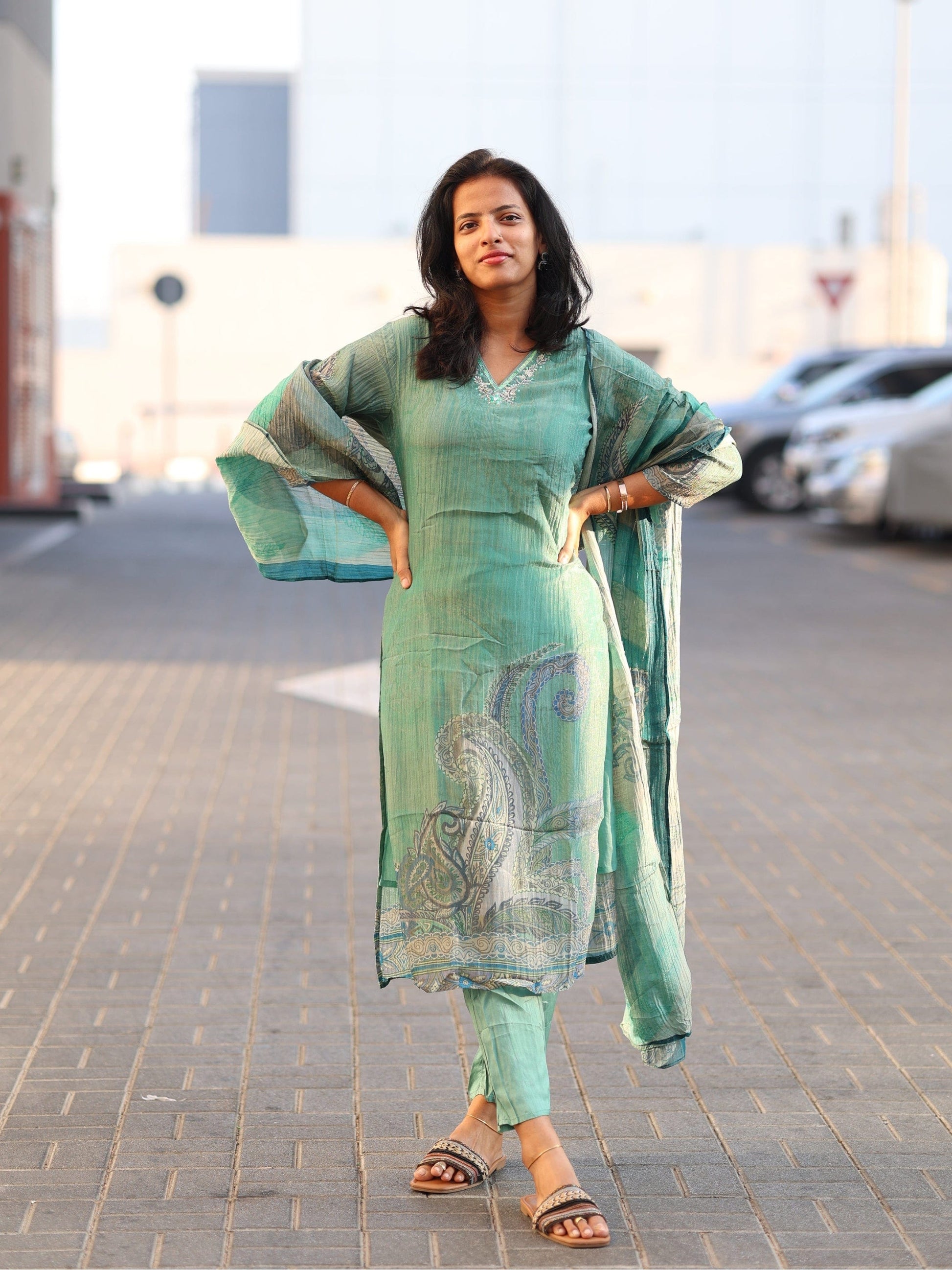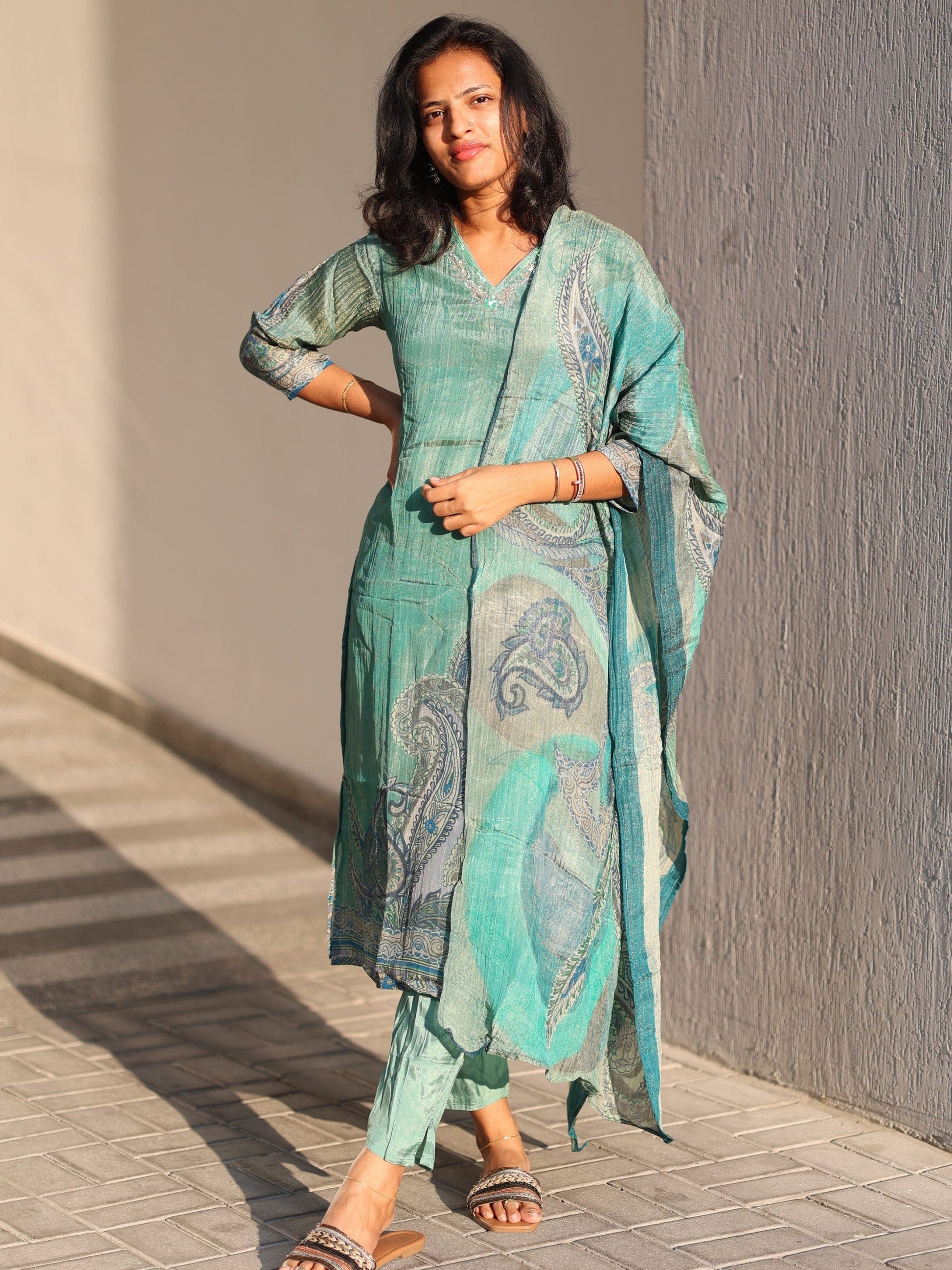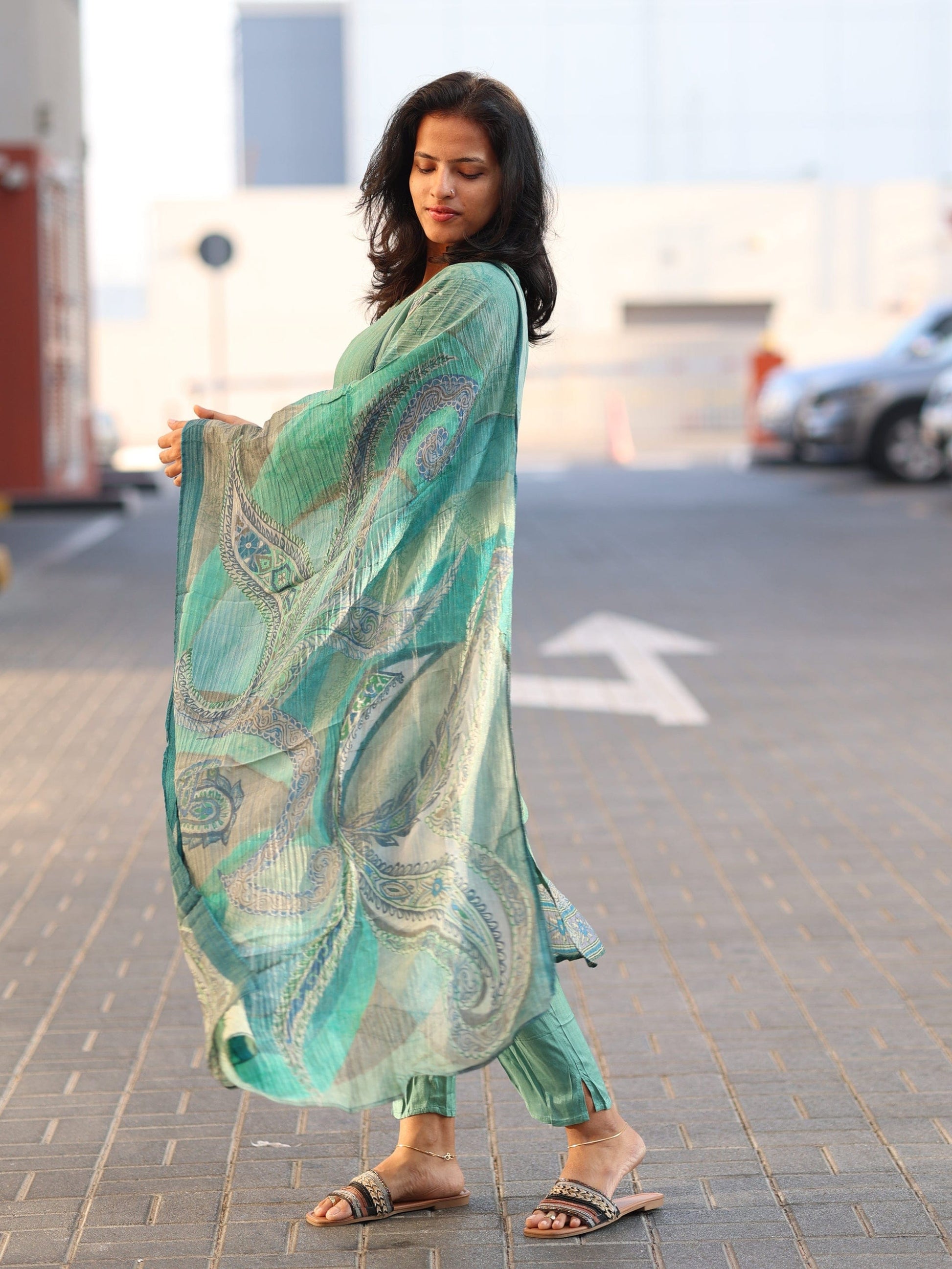 Sea Green 3/4th Sleeves Tissue Paisley Design Pull-on style Calf Length Straight-cut Kurta Set - With Dupatta