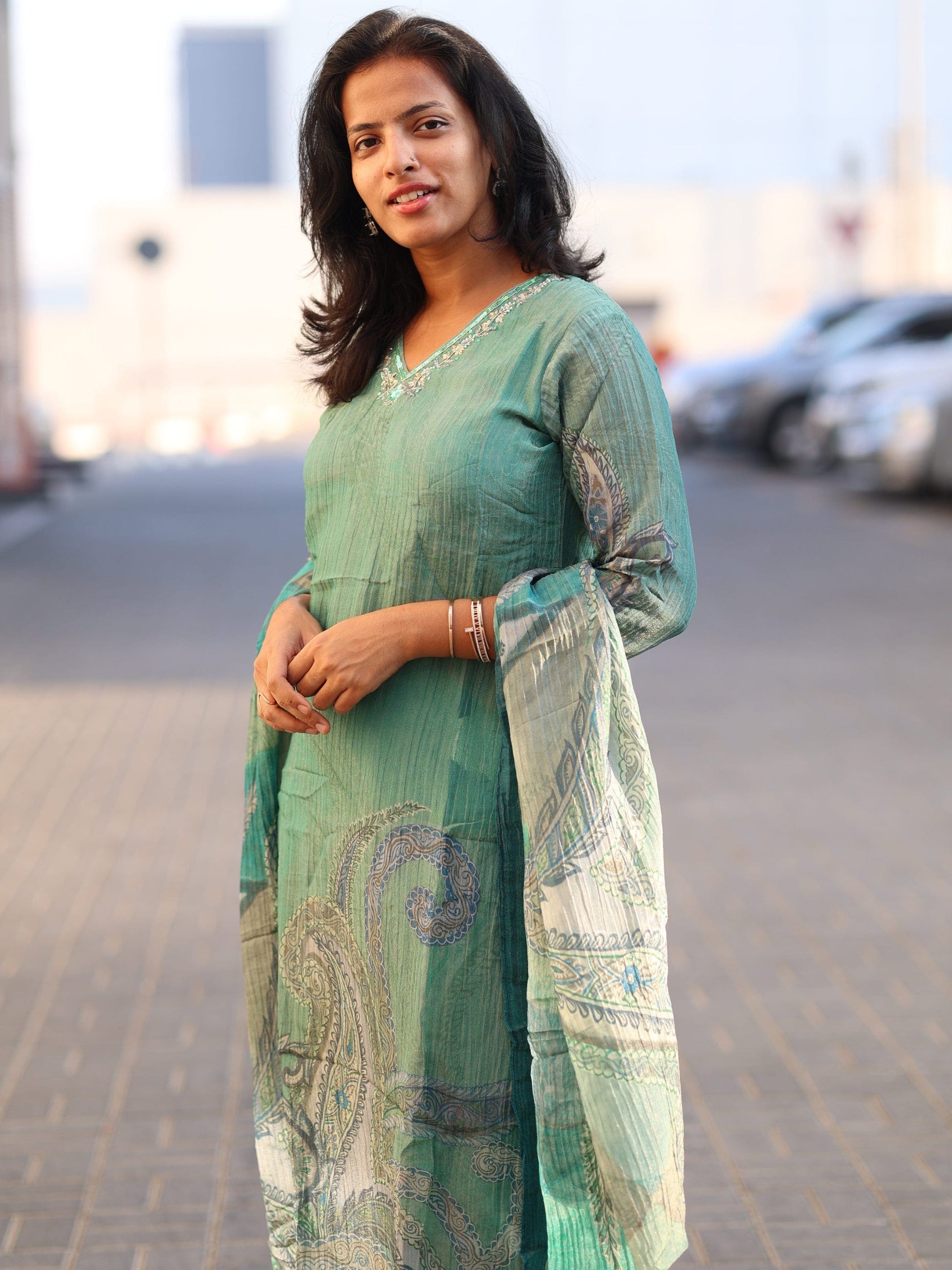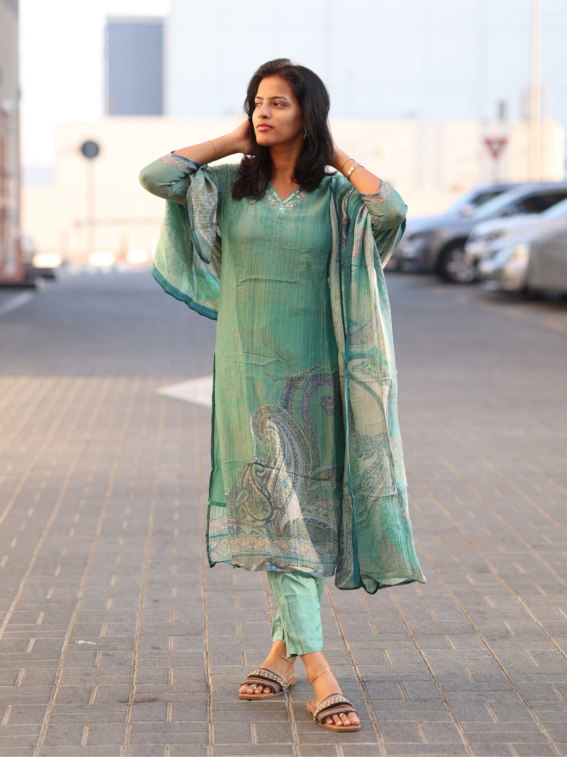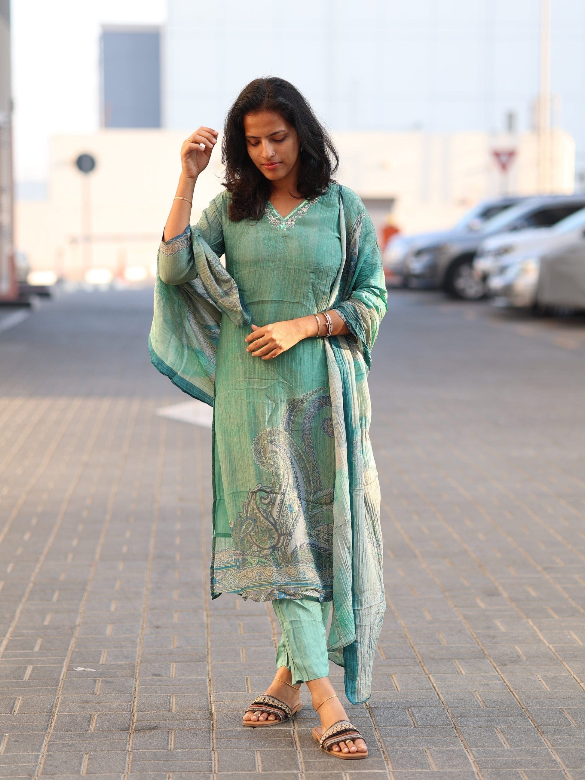 Sea Green 3/4th Sleeves Tissue Paisley Design Pull-on style Calf Length Straight-cut Kurta Set - With Dupatta