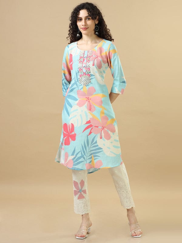 Sky Blue 3/4Th Sleeves Cotton Slub Regular Fit Calf Length A-Line Kurta Set - Without Dupatta