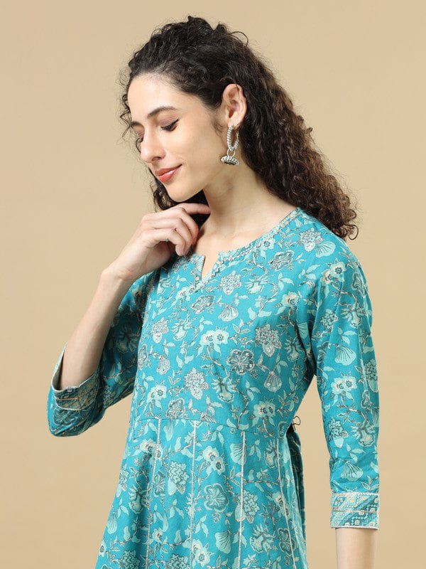 Turquoise 3/4Th Sleeves Cotton Regular Fit Ankle Length Asymmetrical Kurta Set - With Dupatta