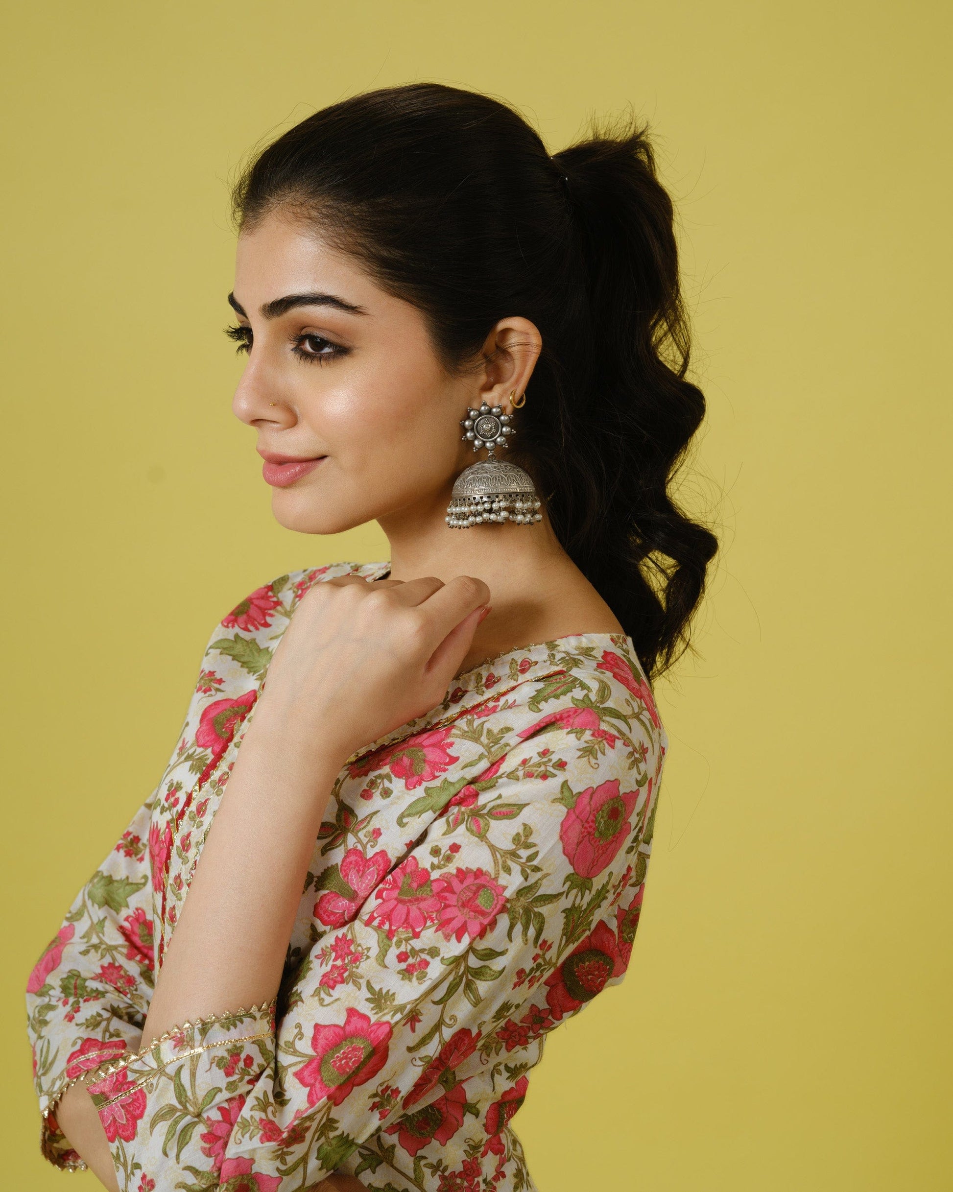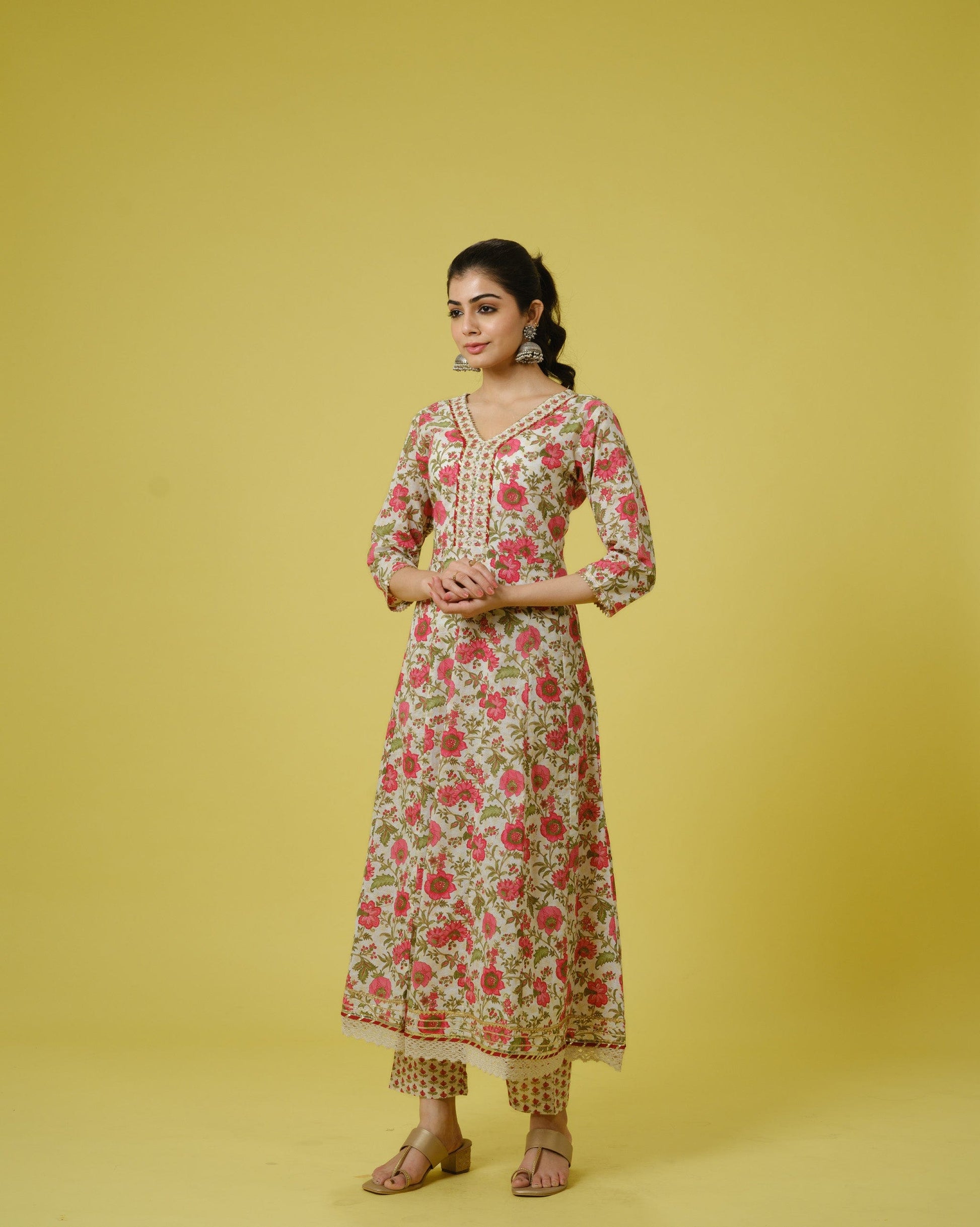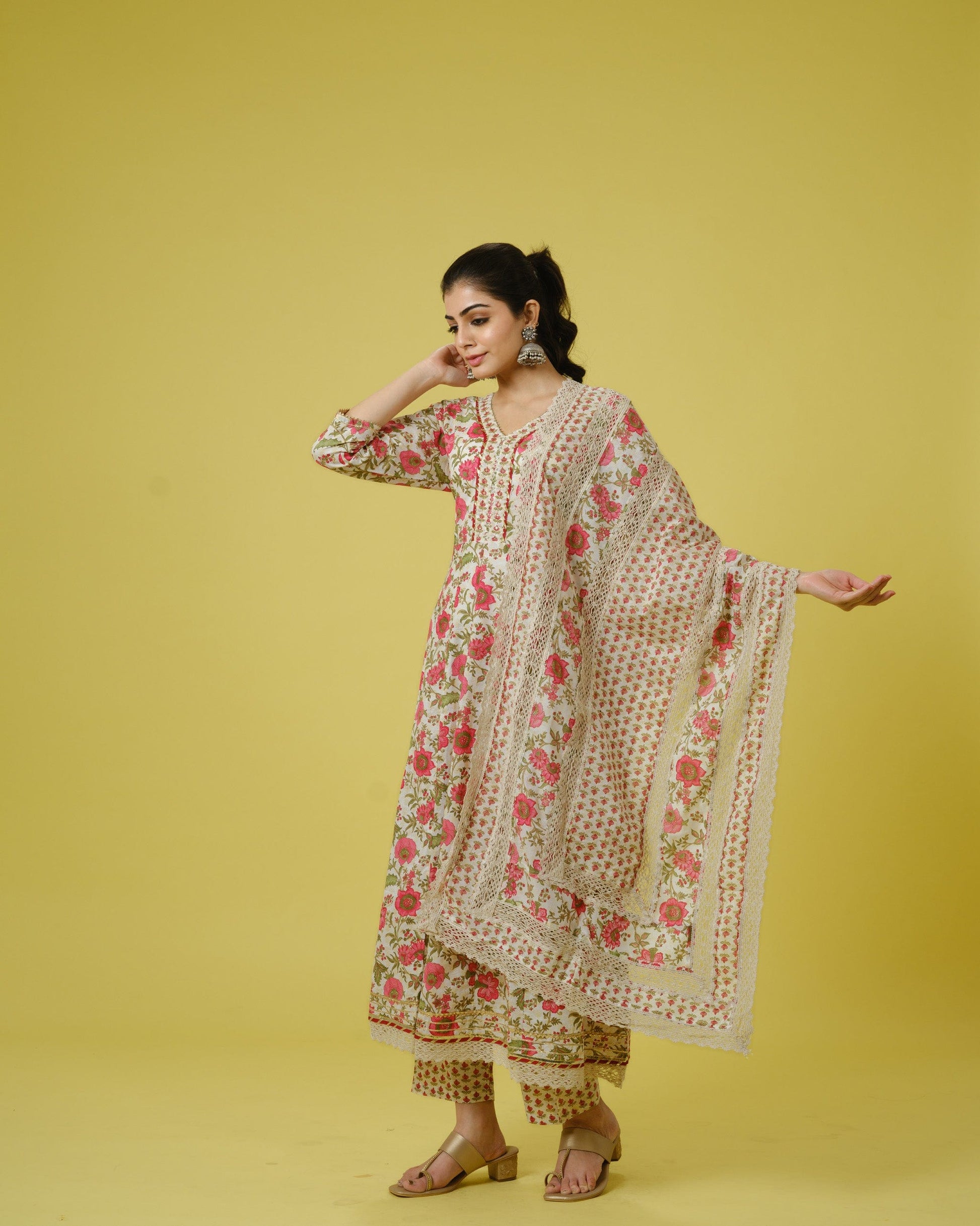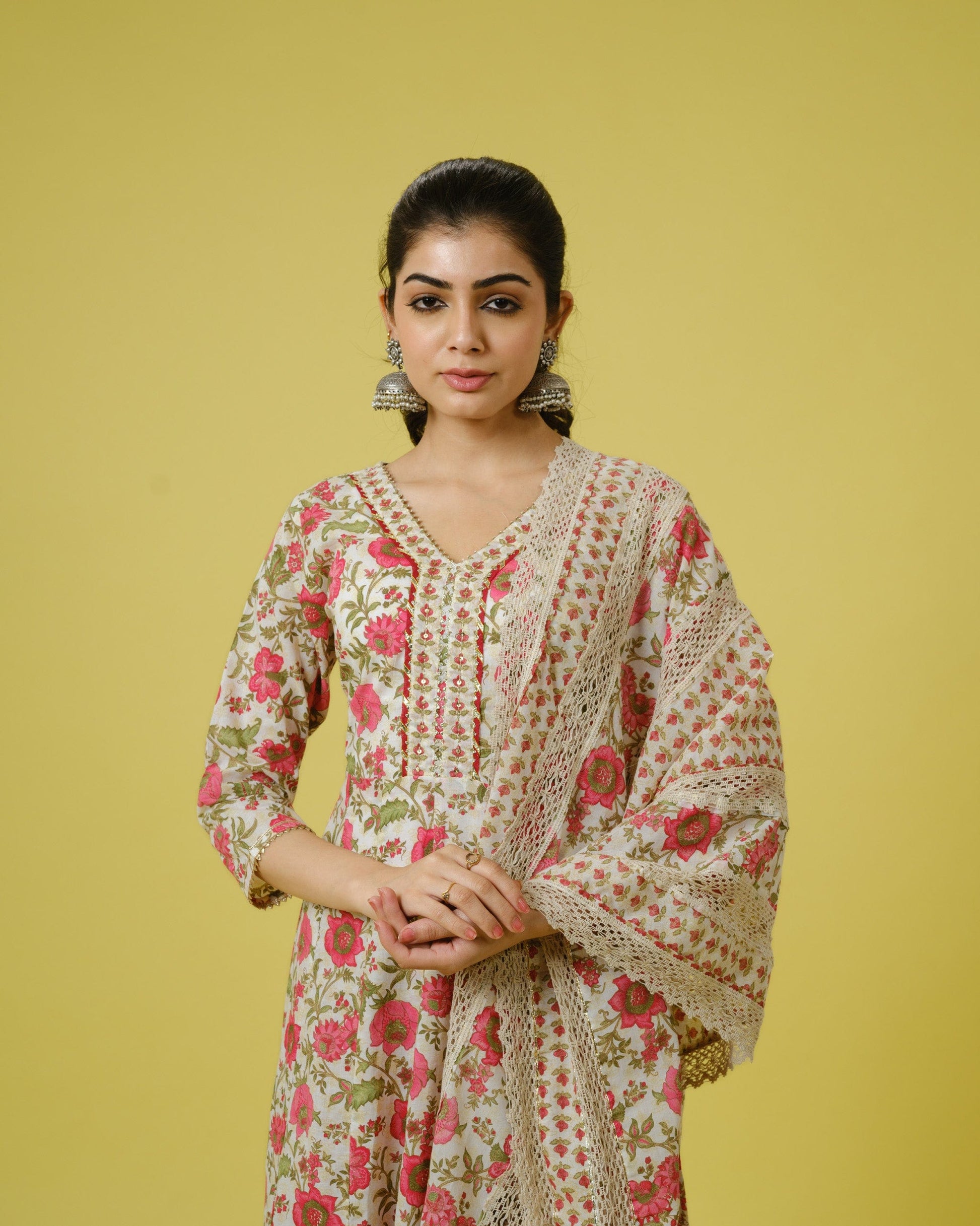 Drape yourself in sheer elegance with this exquisite white cotton Anarkali kurta set, perfect for festive occasions. The kurta, crafted from luxurious cotton, is adorned with intricate sequin and thread work along with delicate lace detailing, enhancing its beauty. Its flared silhouette and V-neckline exude sophistication, while the charming floral print adds a touch of grace. Featuring 3/4th sleeves and regular fit with lace detailing, it offers a perfect blend of tradition and style. Paired with matching white trousers crafted from floral cotton fabric, offering ankle-length comfort with a pull-on style and mid-rise elastic waistband. Complete your ensemble with a white cotton dupatta featuring floral motifs and lace detailing, adding a graceful finishing touch to your look. Elevate your festive attire with this timeless kurta set that effortlessly combines elegance and charm.