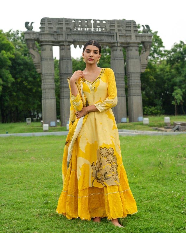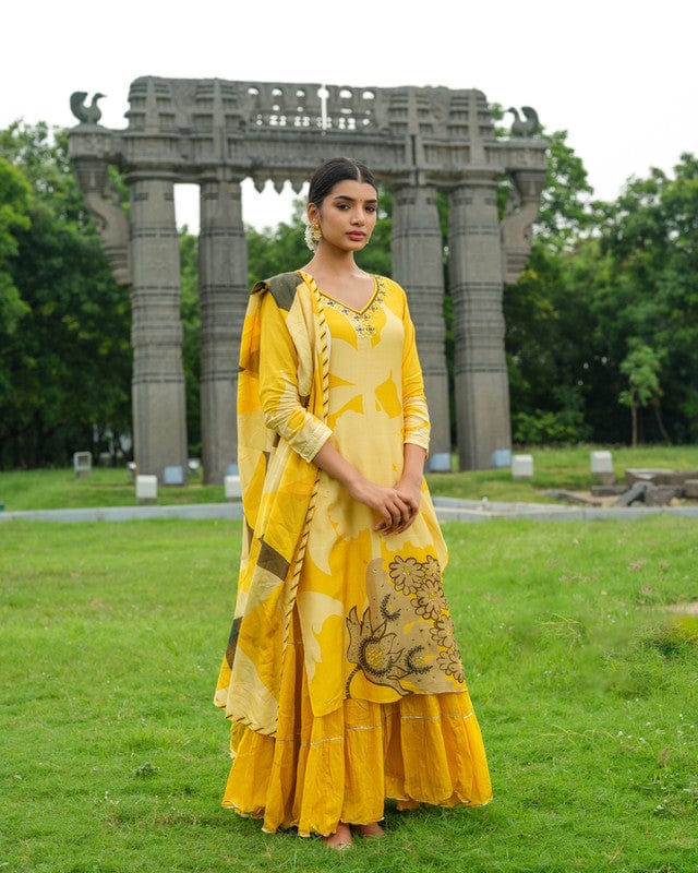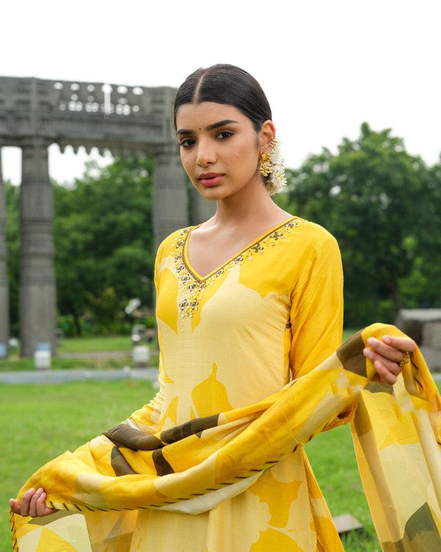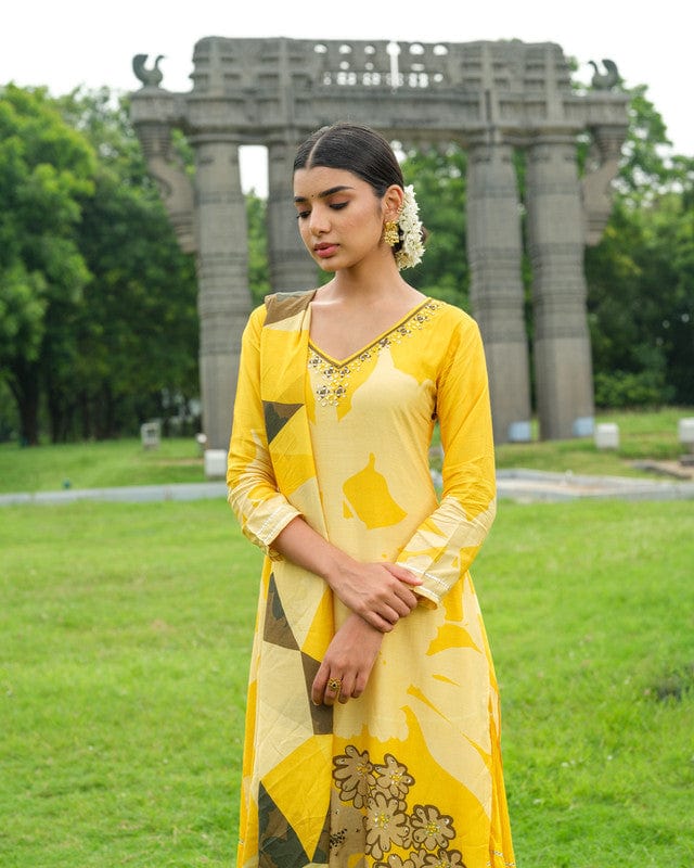 Yellow 3/4th Sleeves Floral print with embellishment work Viscose Calf length Kurta Set - With Dupatta