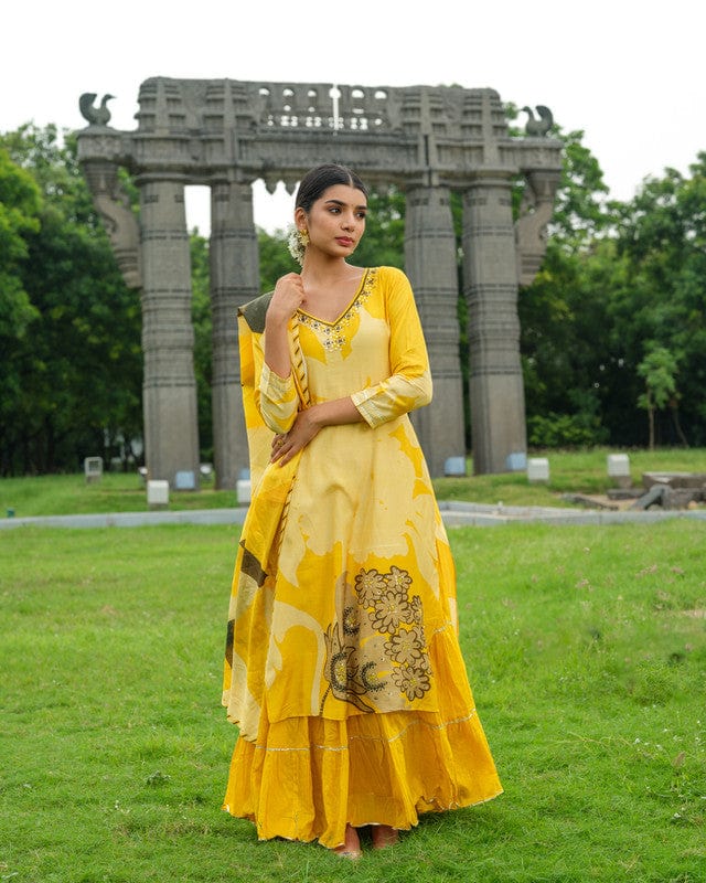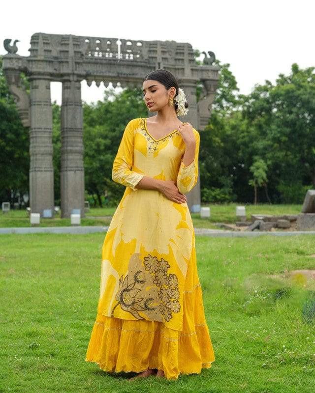This Yellow kurta set from the Kala Thoranam collection exudes elegance and charm. The viscose kurta features a V-neckline, silver lace work, floral print with embellishments, and a straight, calf-length design with 3/4th sleeves and side slits for a sophisticated look. Paired with a flared, floor-length skirt adorned with lace work and a floral print, this ensemble is perfect for festive occasions. The skirt’s elastic waistband ensures a comfortable fit, while the tiered design adds a graceful touch. Easy to maintain, this set is a stylish and versatile choice for your wardrobe.